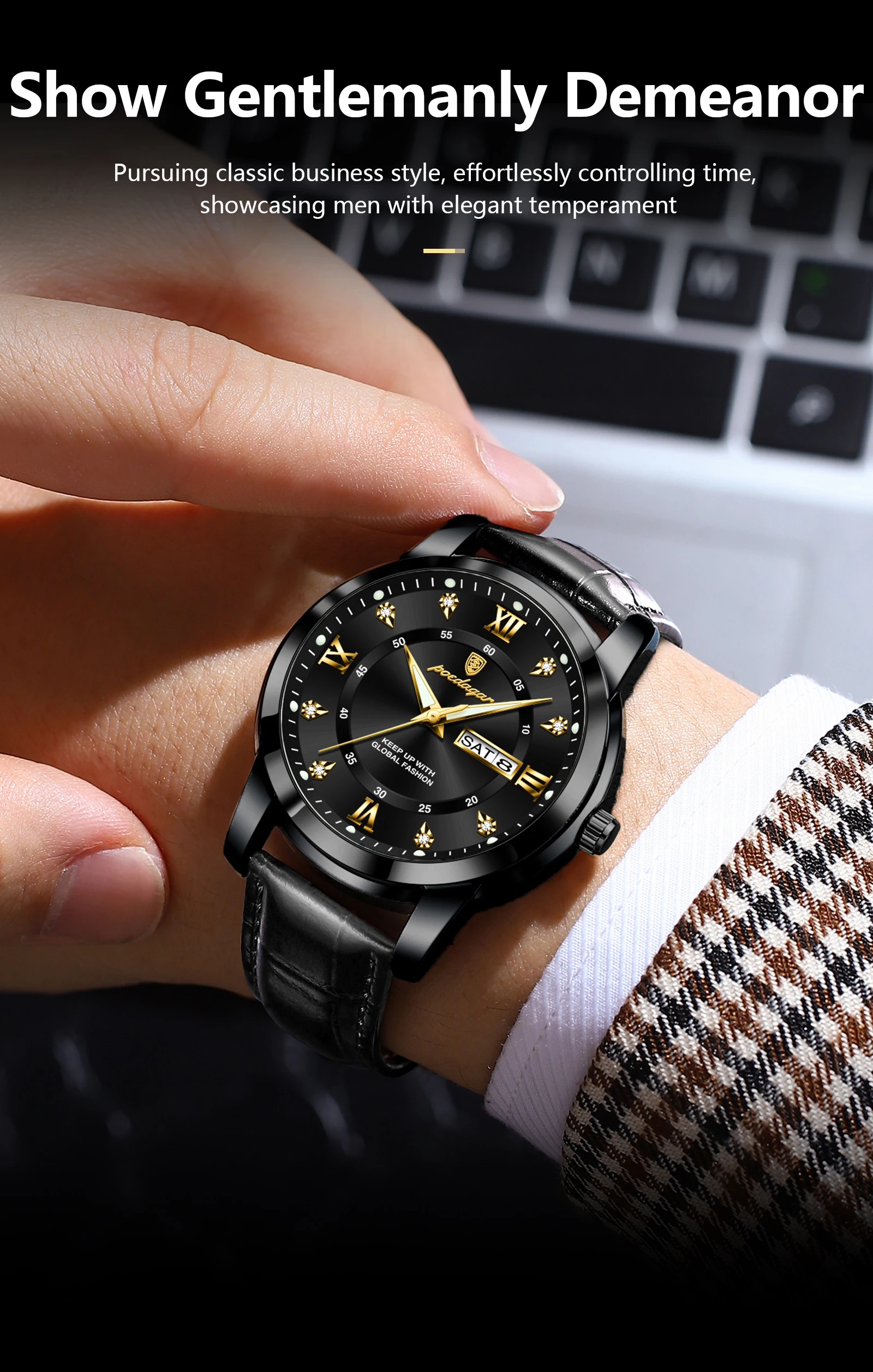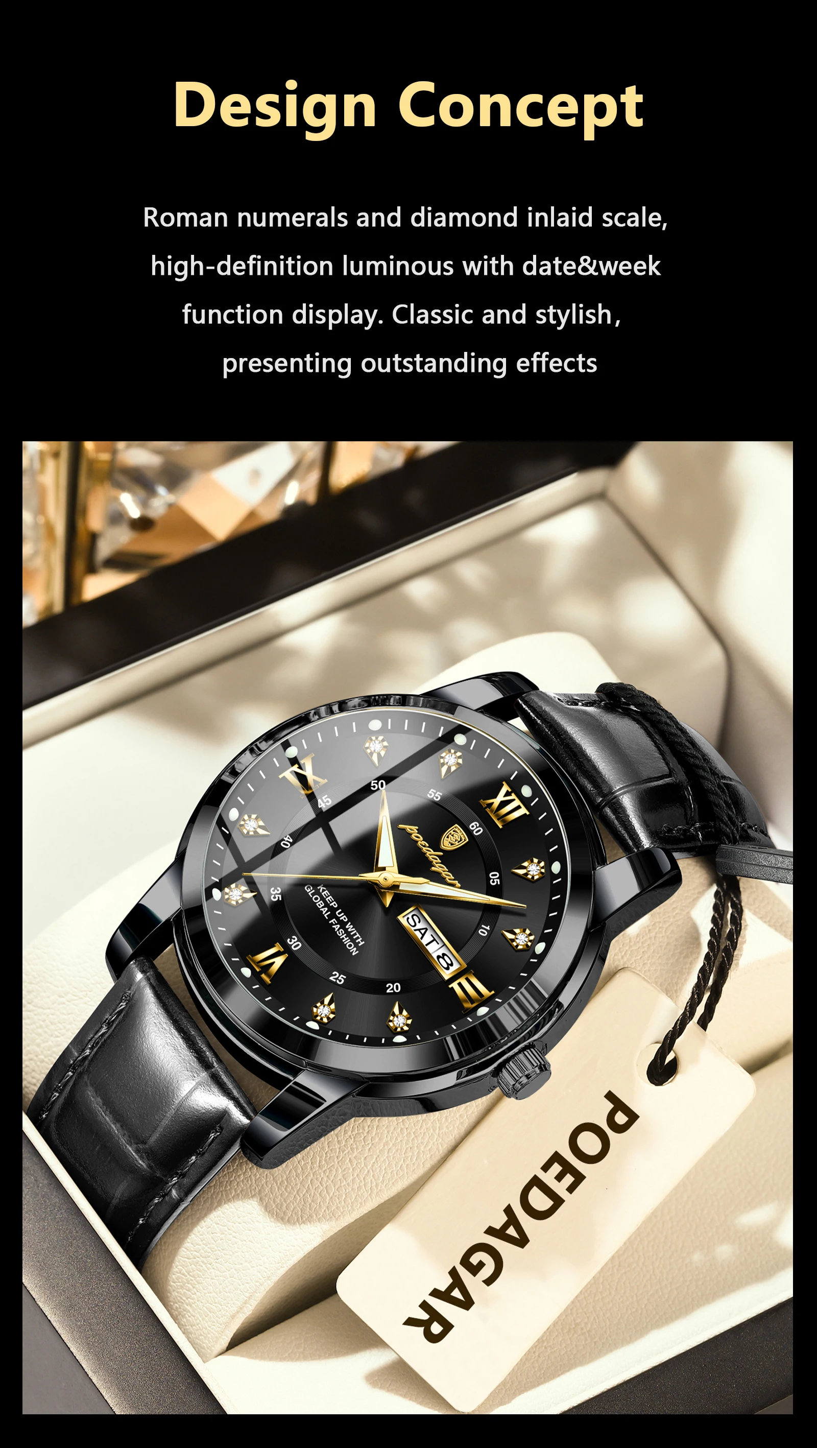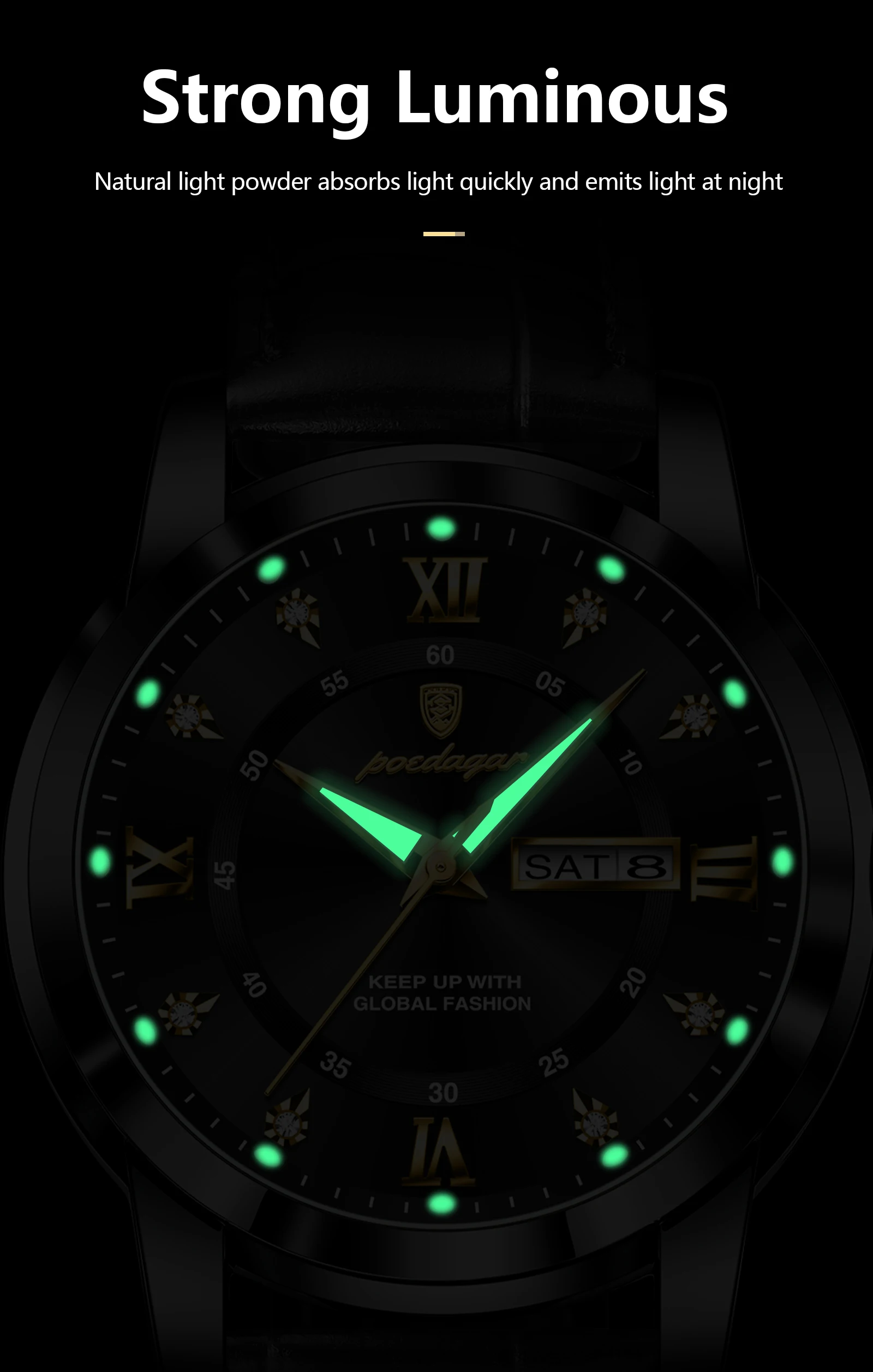 POEDAGAR Trendy Men Watch Leather Date Week Luxury Quartz Man Wristwatch Waterproof Luminous Business Casual Men's Watches Reloj