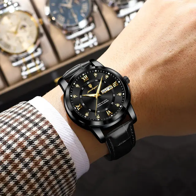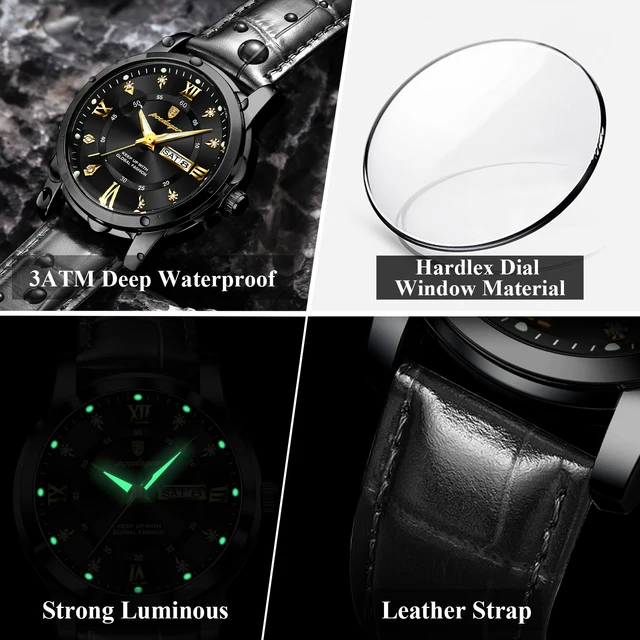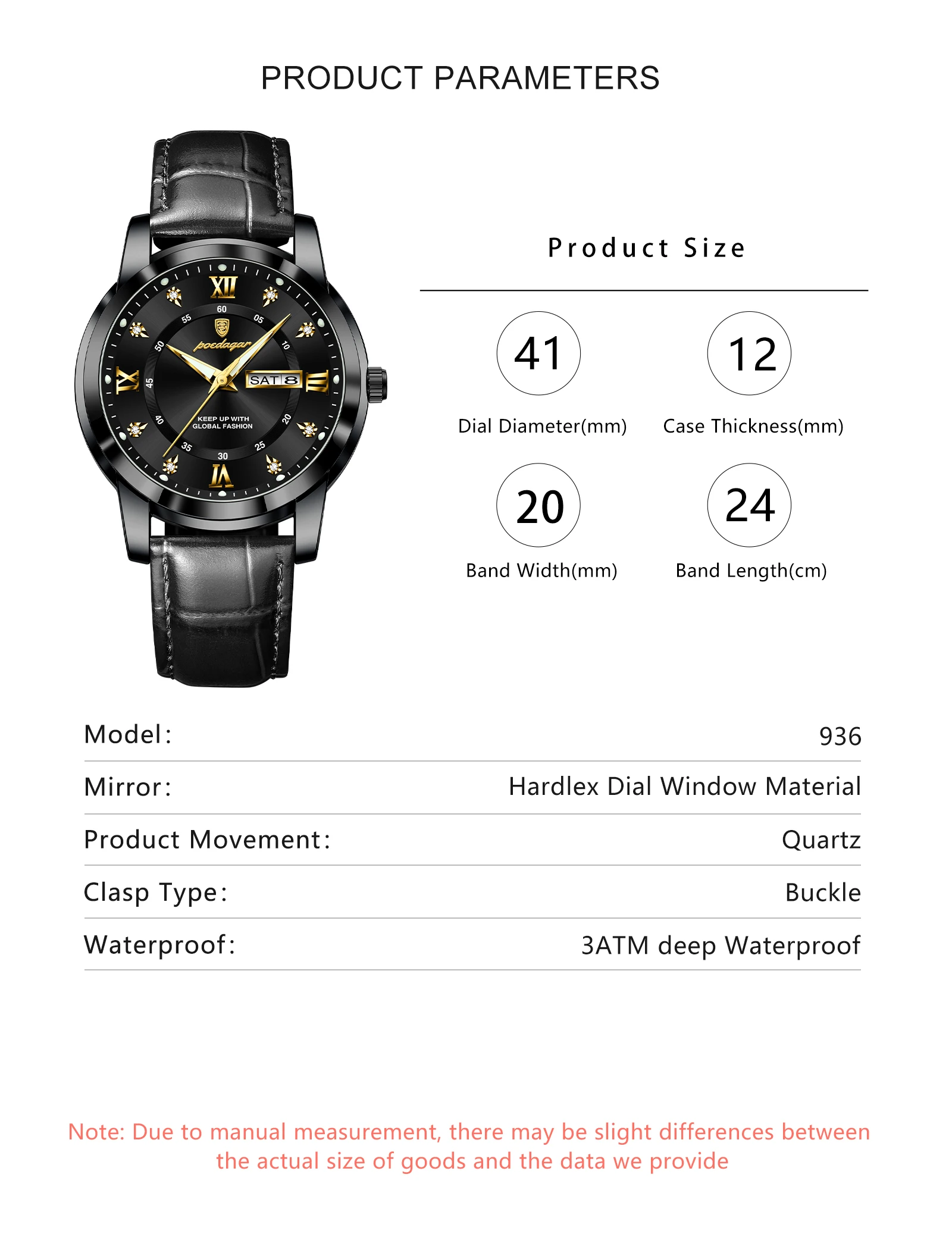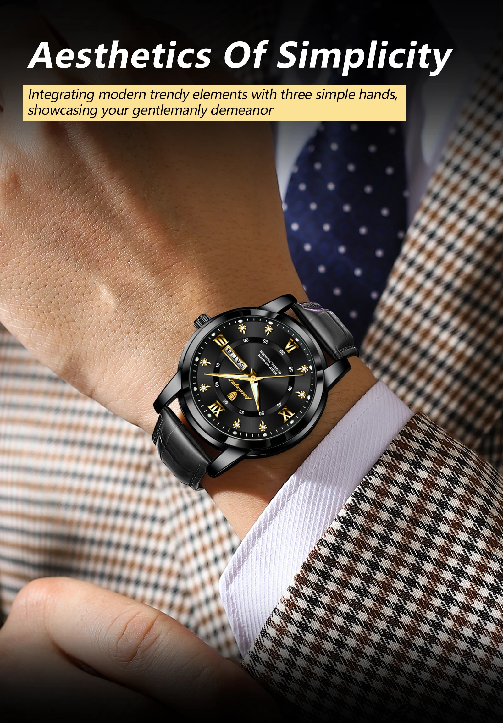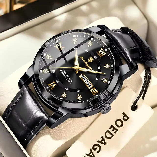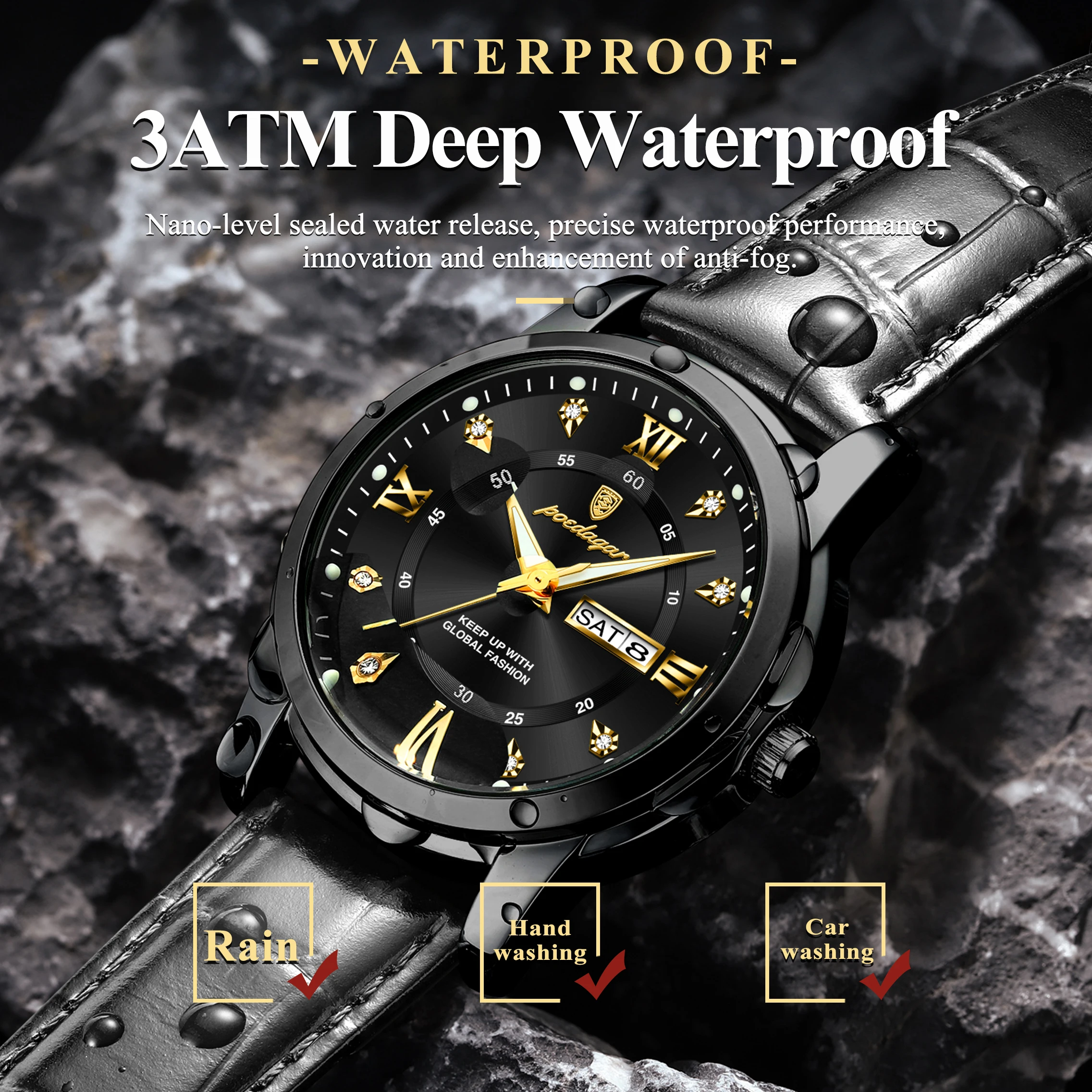 POEDAGAR Trendy Men Watch Leather Date Week Luxury Quartz Man Wristwatch Waterproof Luminous Business Casual Men's Watches Reloj