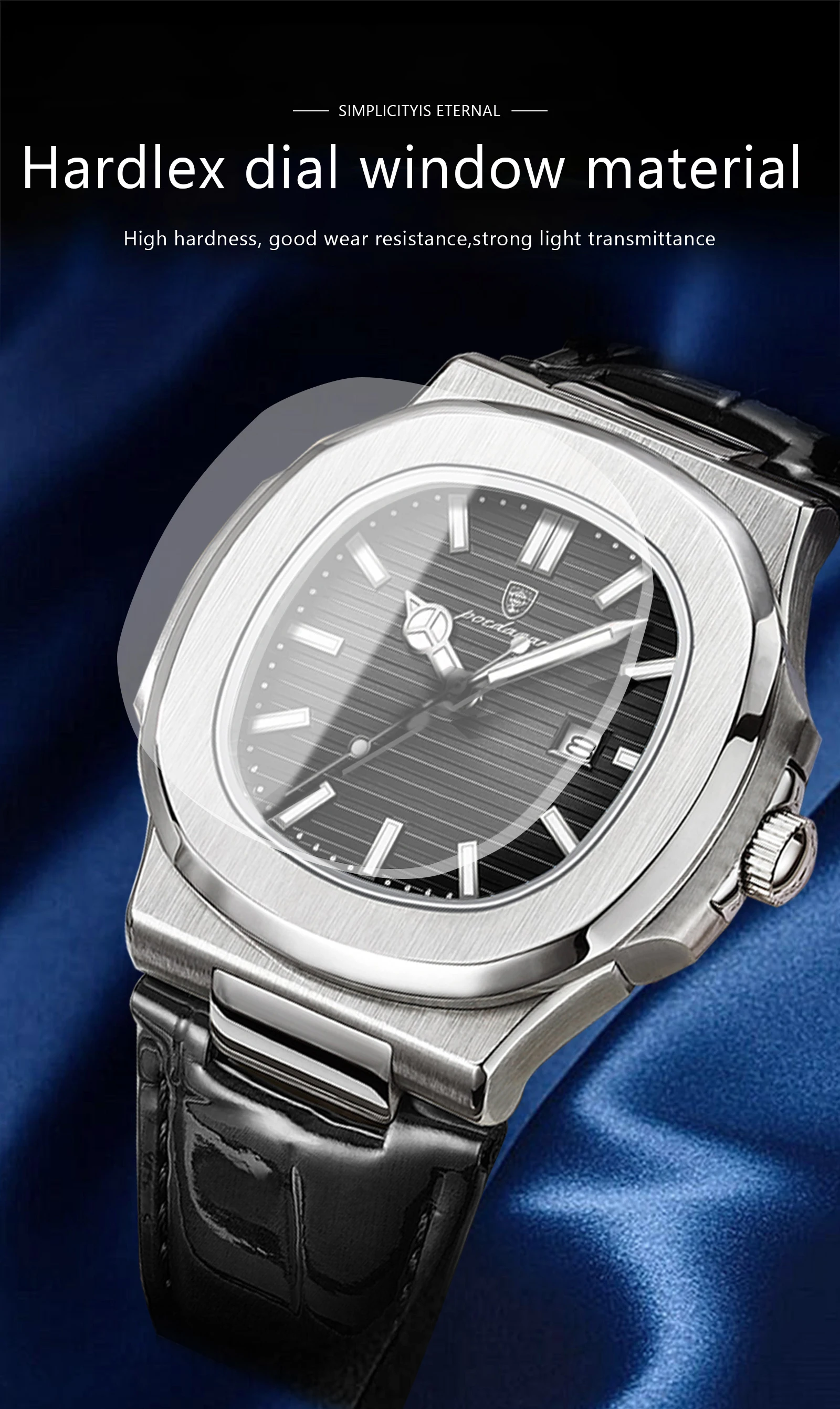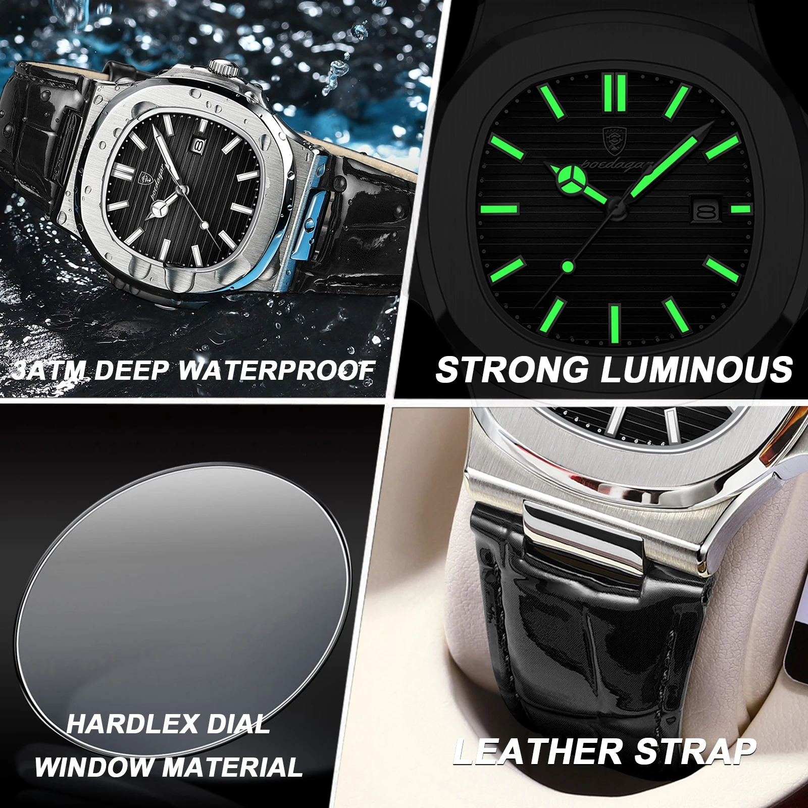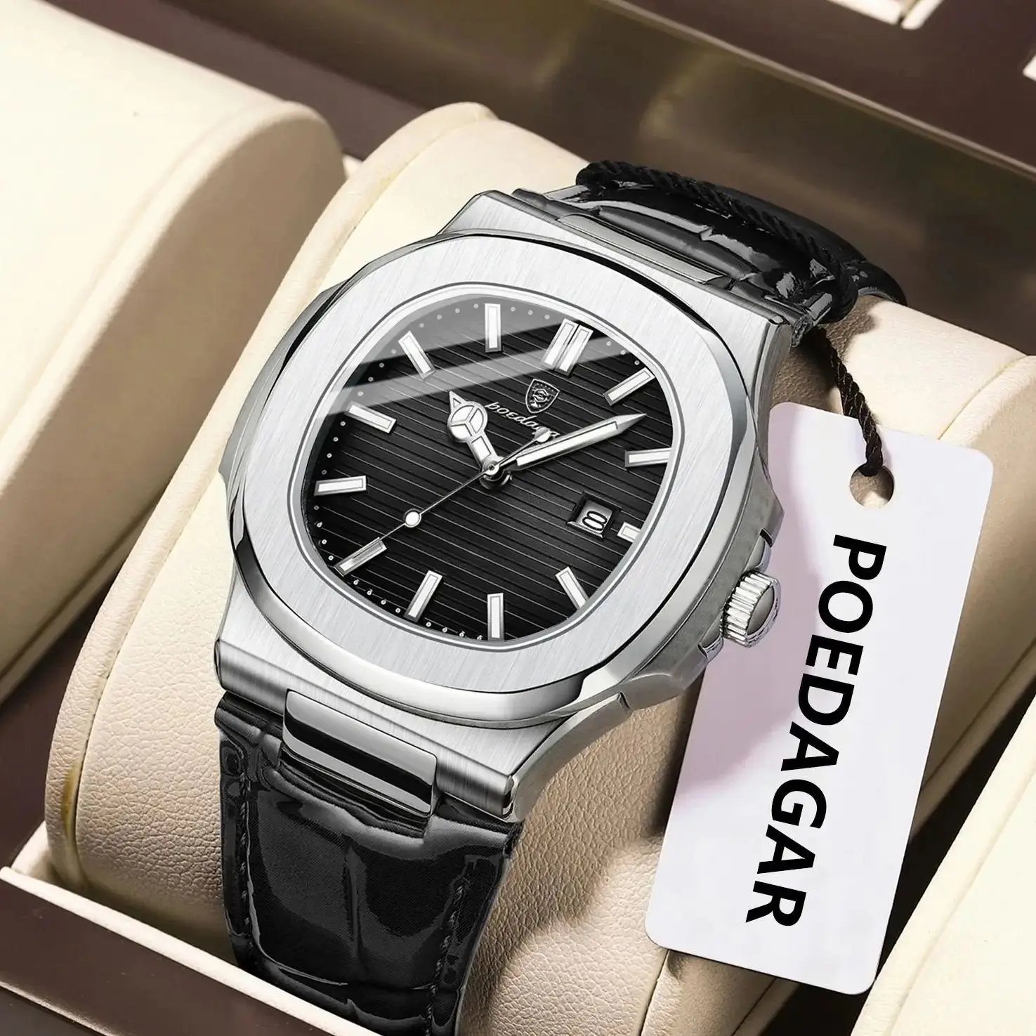 POEDAGAR Business Men's Quartz Wristwatch Date Waterproof Luminous Leather Watches For Men High Quality Square Stylish Man Watch