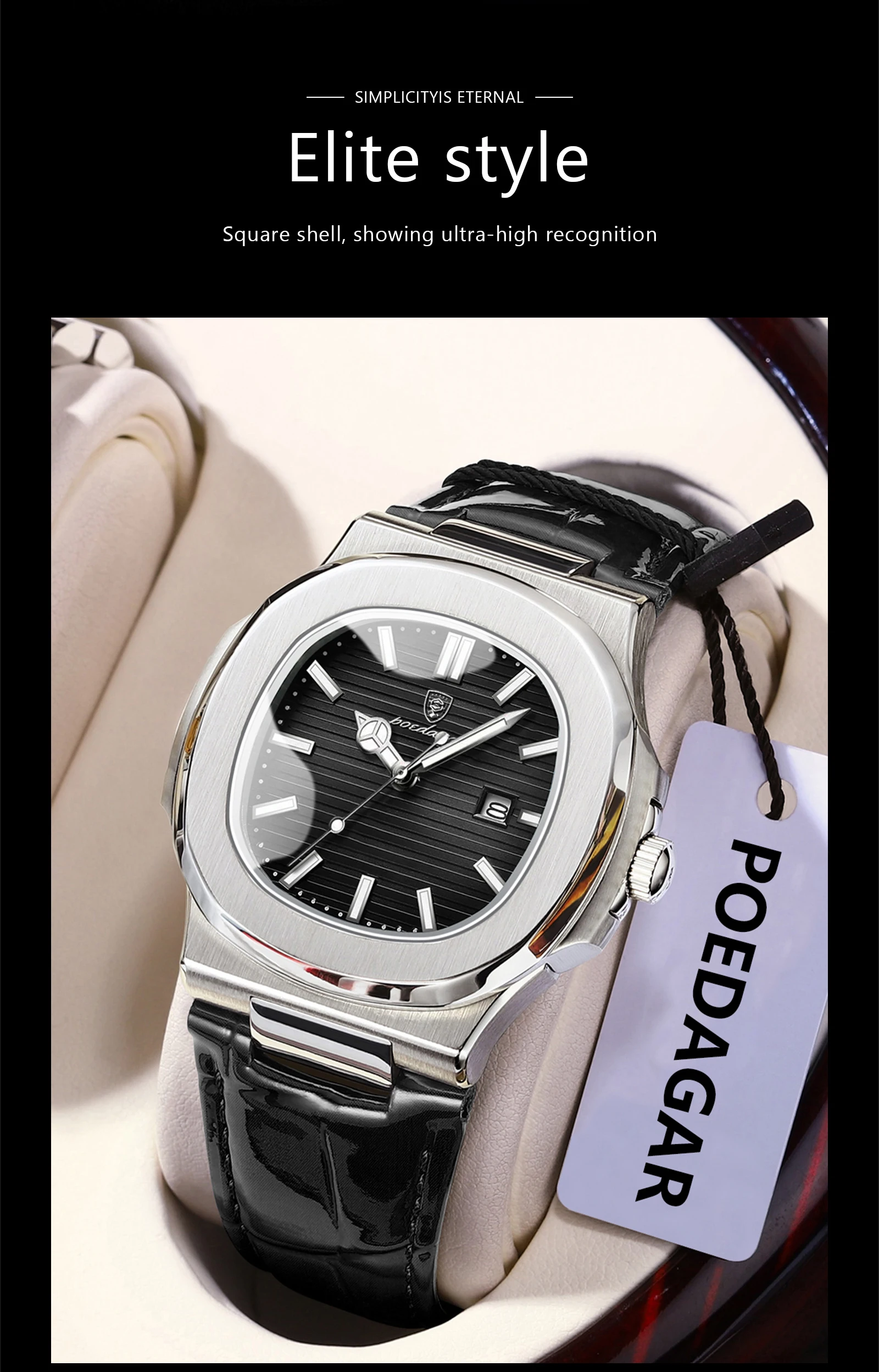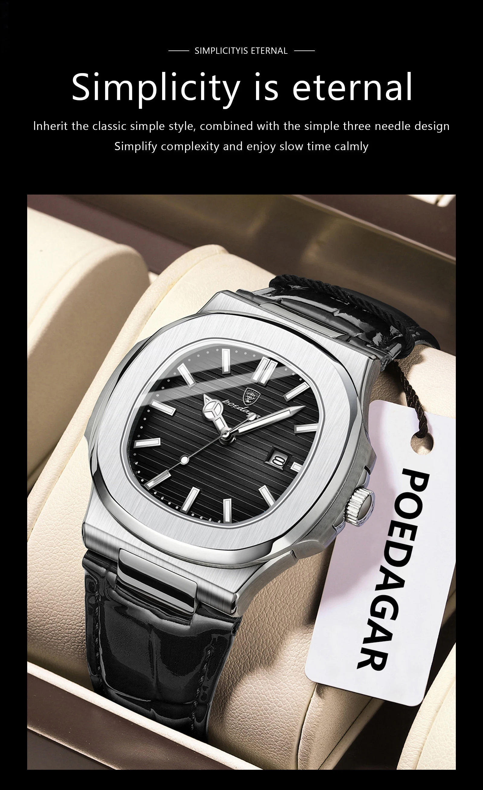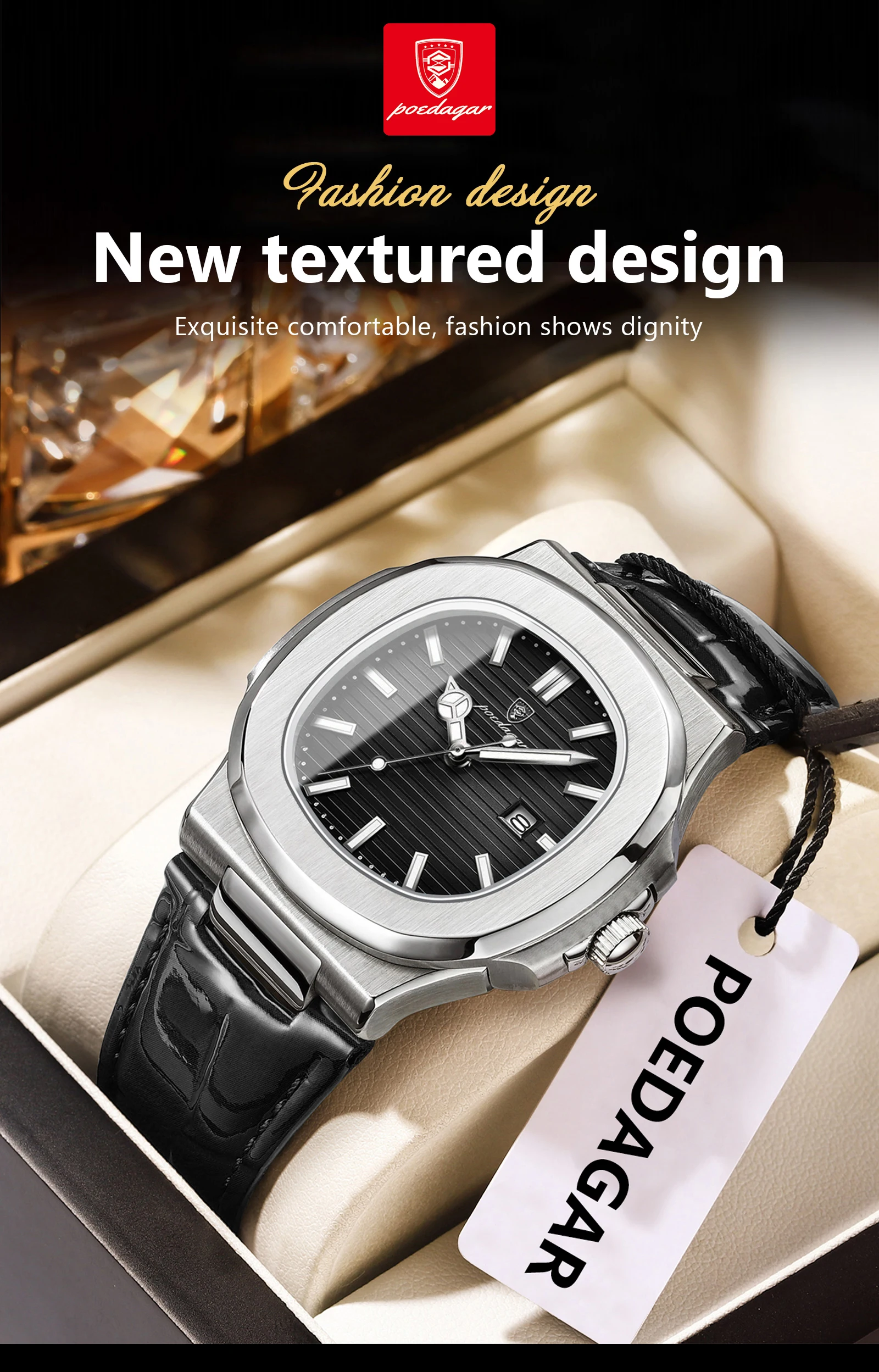 POEDAGAR Original Fashion Men's Wristwatch Date Waterproof Luminous Leather Watches For Men High Quality Square Quartz Man Watch