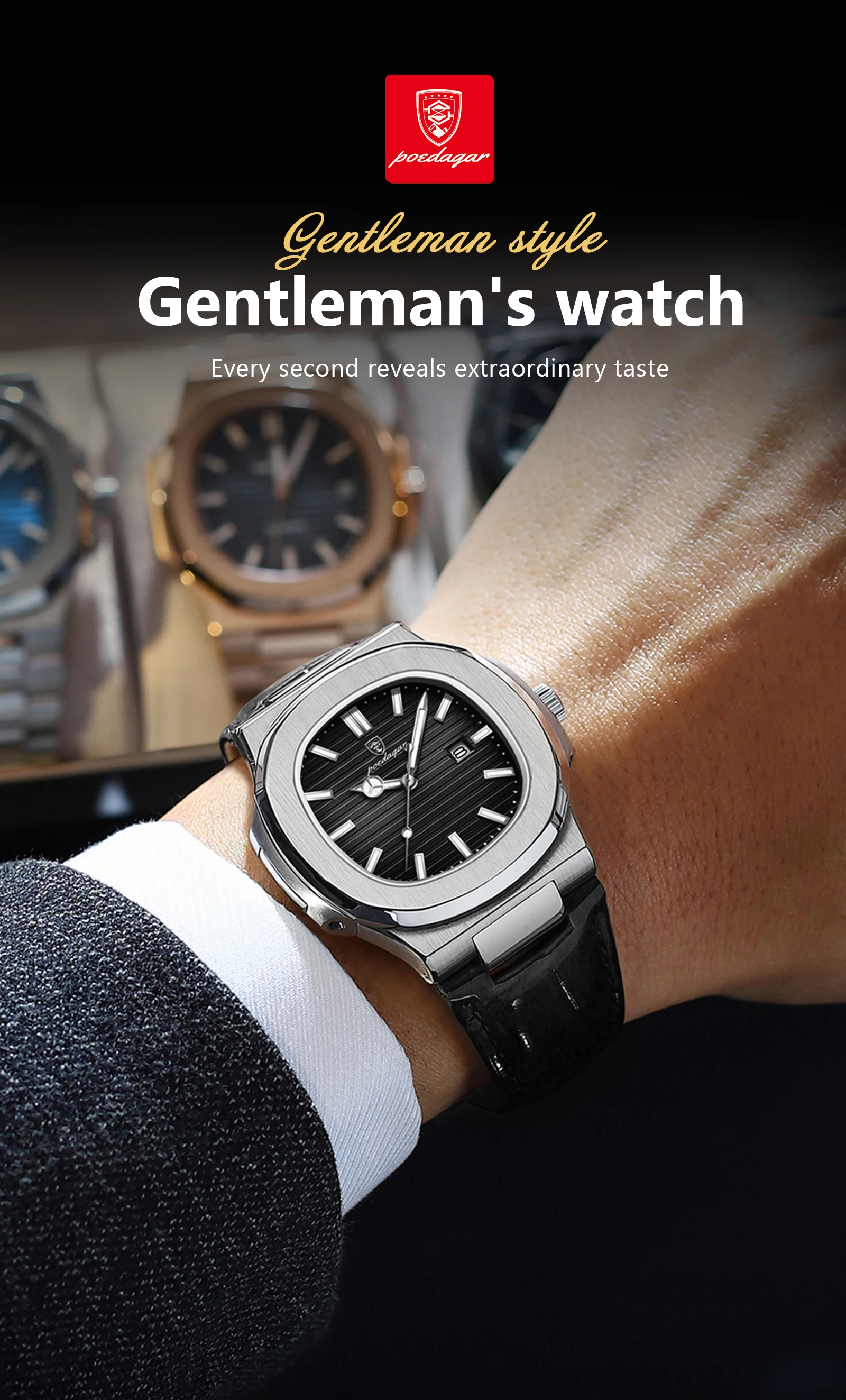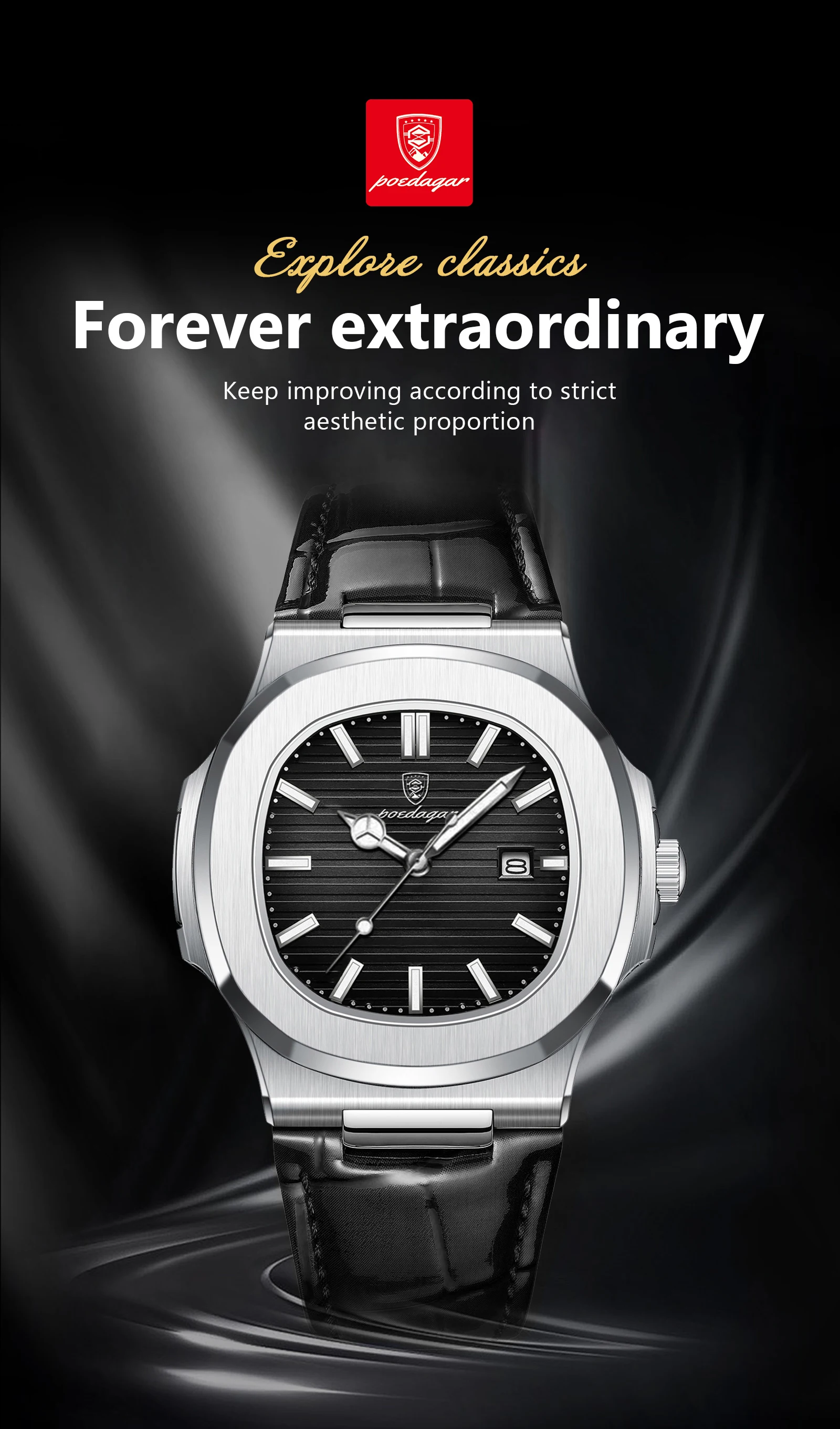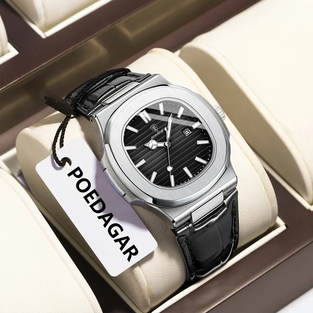 POEDAGAR Original Fashion Men's Wristwatch Date Waterproof Luminous Leather Watches For Men High Quality Square Quartz Man Watch