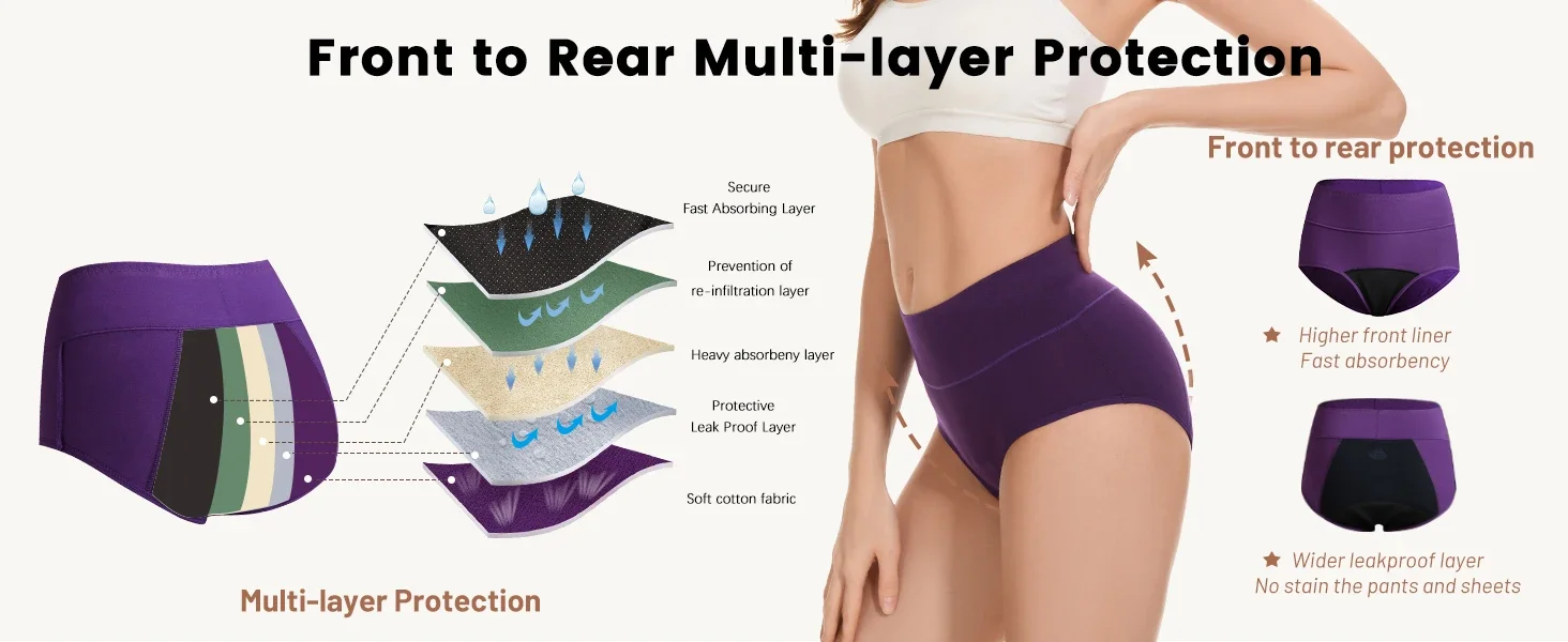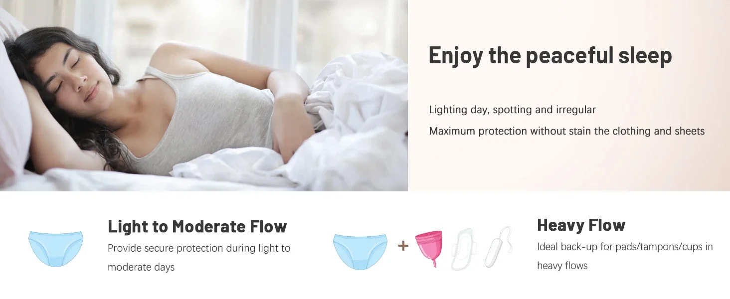 sleep safe and sound, whether you lie on your back or front, whether light or heavy flow, with Molasus full front to rear protection panties, your sheets will be protected from heavy menstrual flow, irregular spotting and random discharges.
