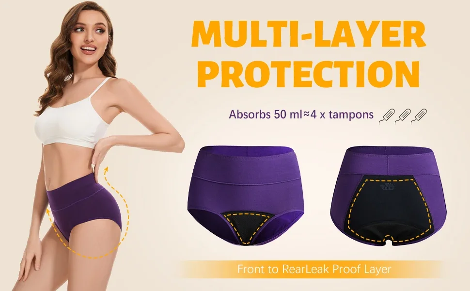 Absorbency for up to 4 tampons for times of incontinence, heavy menstrual flow, discharge, pee, or bladder leaks. Our reusable period underwear makes sure you are fully protected in times of need.