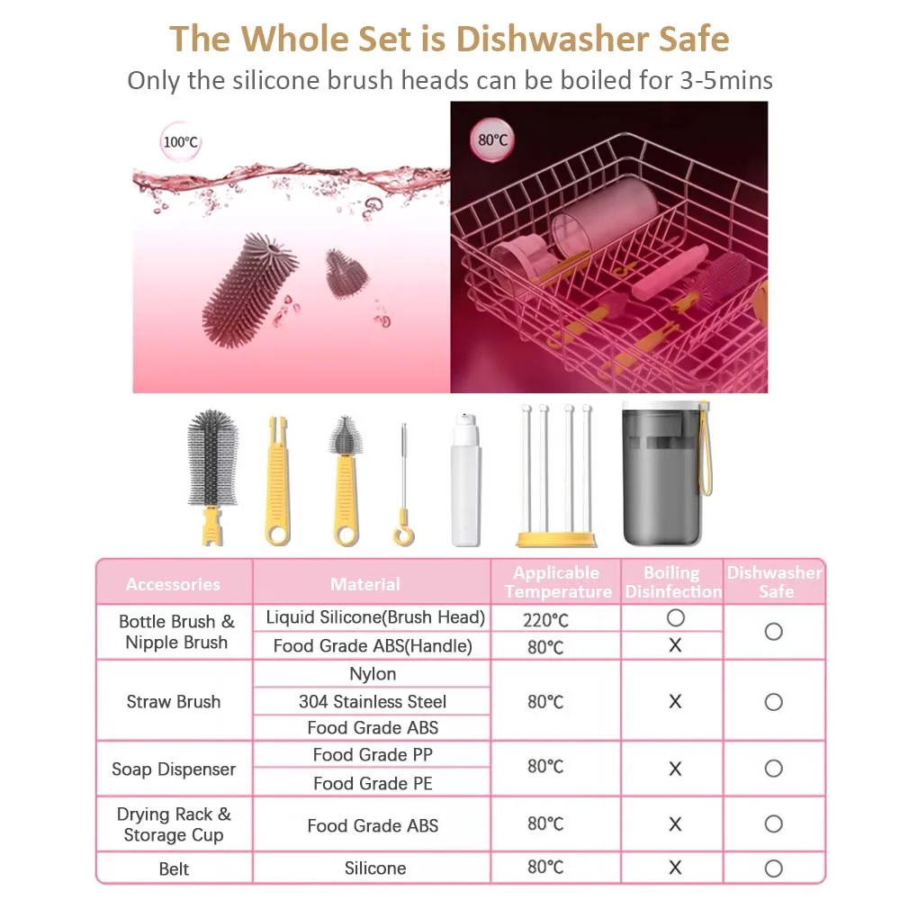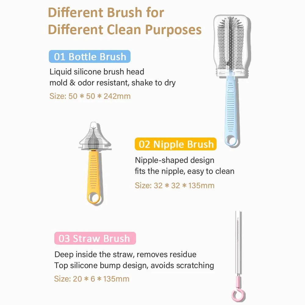 【Nipple Brush & Straw Cleaning Brush】The nipple brush with liquid silicone brush head and food grade ABS brush handle, and the straw cleaning brush made of nylon + stainless steel + food grade ABS material, both have special shapes for different clean purposes.