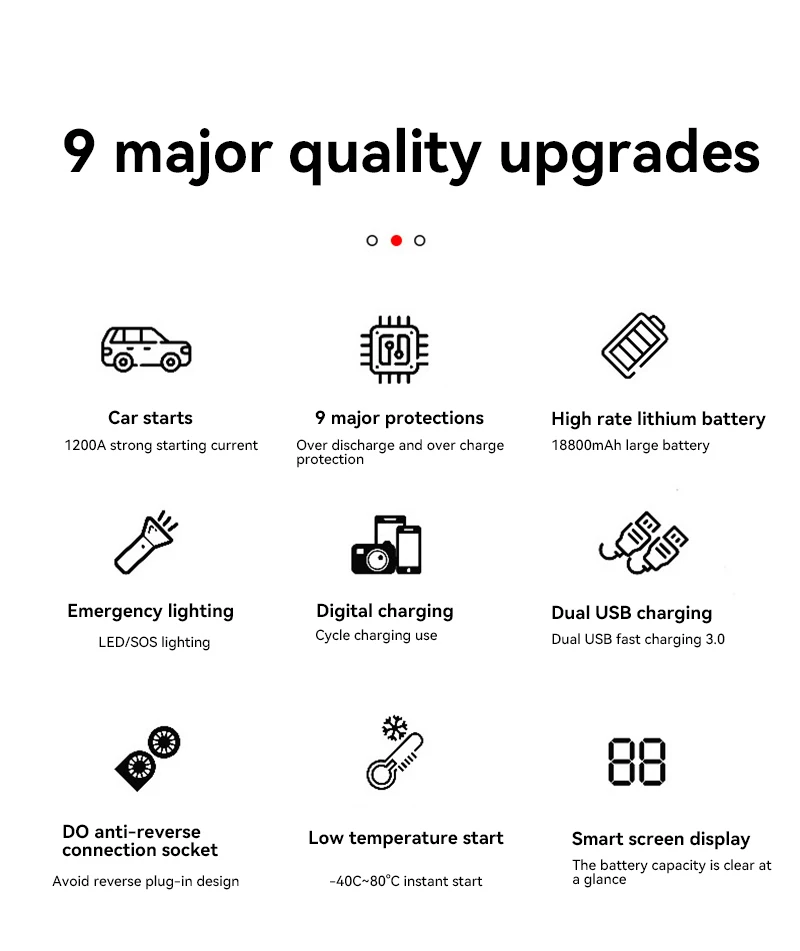 4. The charge speed or discharge speed will be fast during the last 15% power of the jump starter. Please do not worry about these problems. This is the characteristic of high-rate lithium batteries, and it will not affect product quality and normal use.