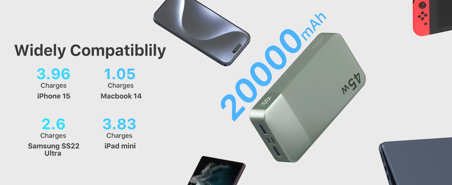 【Powerful Capacity】NOBIS Portable phone charger with 20000mah battery. Full capacity support charge Macbook 14 1.05 times, iPhone 15 3.96 times, Samsung s22 Ultra 2.6 times, iPad mini 3.83 times.74Wh meets airlines requirements, ready for air travel