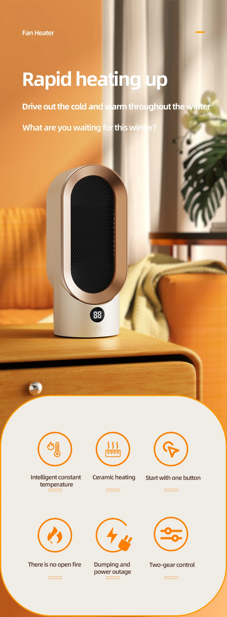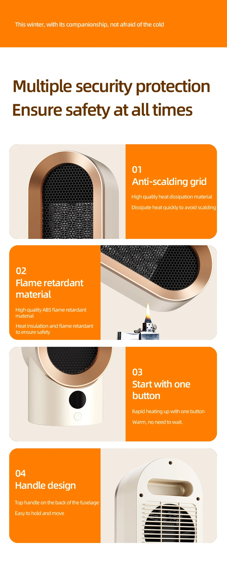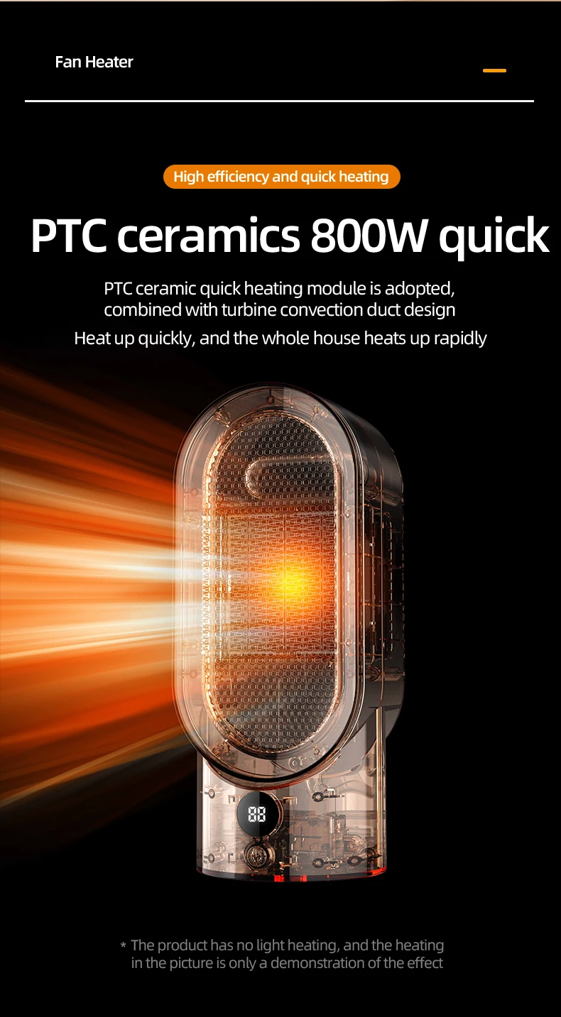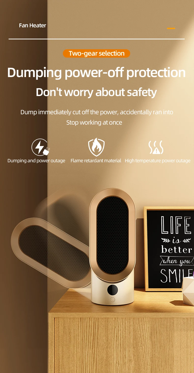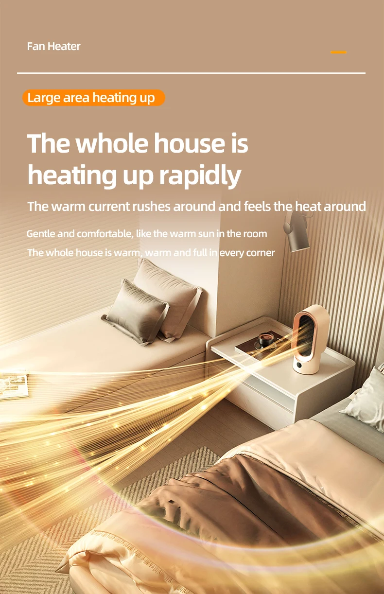 Although the small portable heater has a small volume, the body is made of flame retardant PP material, and the added flame retardant can suppress flame signs, providing you with strict protection at all times.