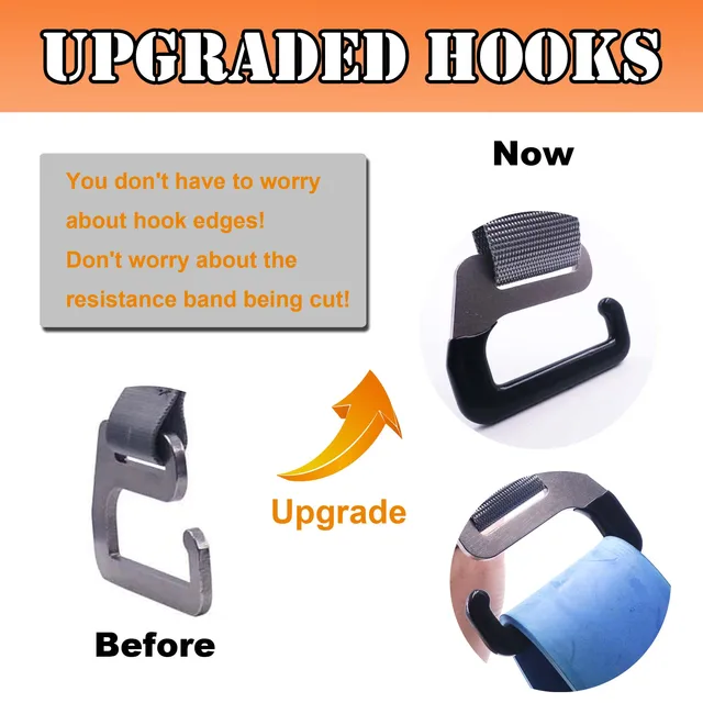 2.UNIQUE RESISTANCE BAND HOOK: Stainless steel e-type Overmolded hook, durable and easier to use than other hooks, perfect for flat resistance bands without damaging the band.
