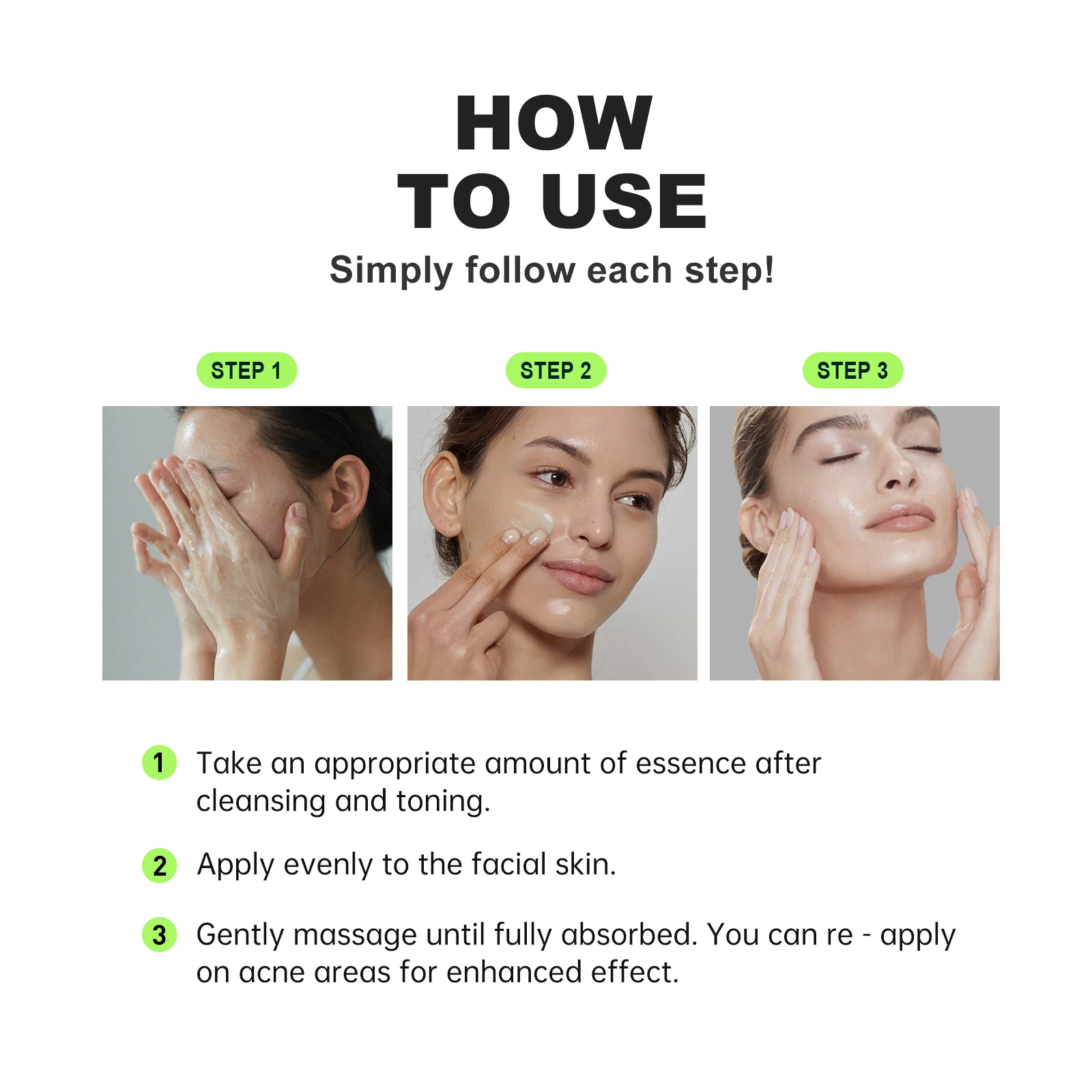 Step 3: Gently massage until fully absorbed. You can re – apply on acne areas for enhanced effect.