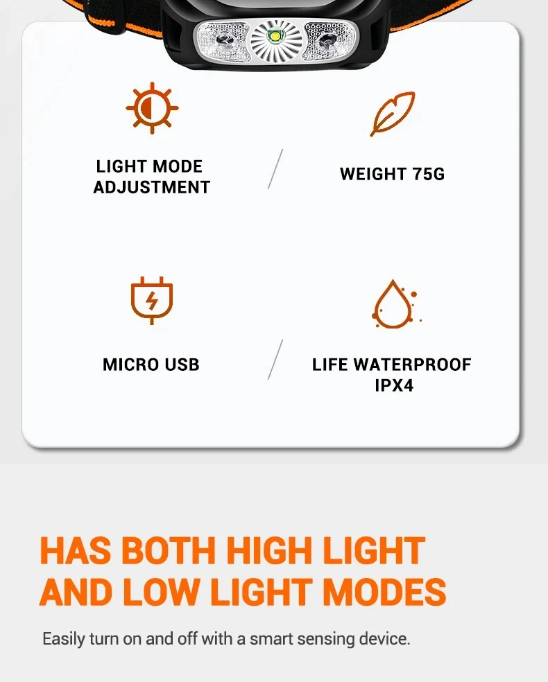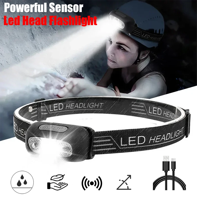 Package contains: sensor headlamp + retractable light belt + USB charging cable