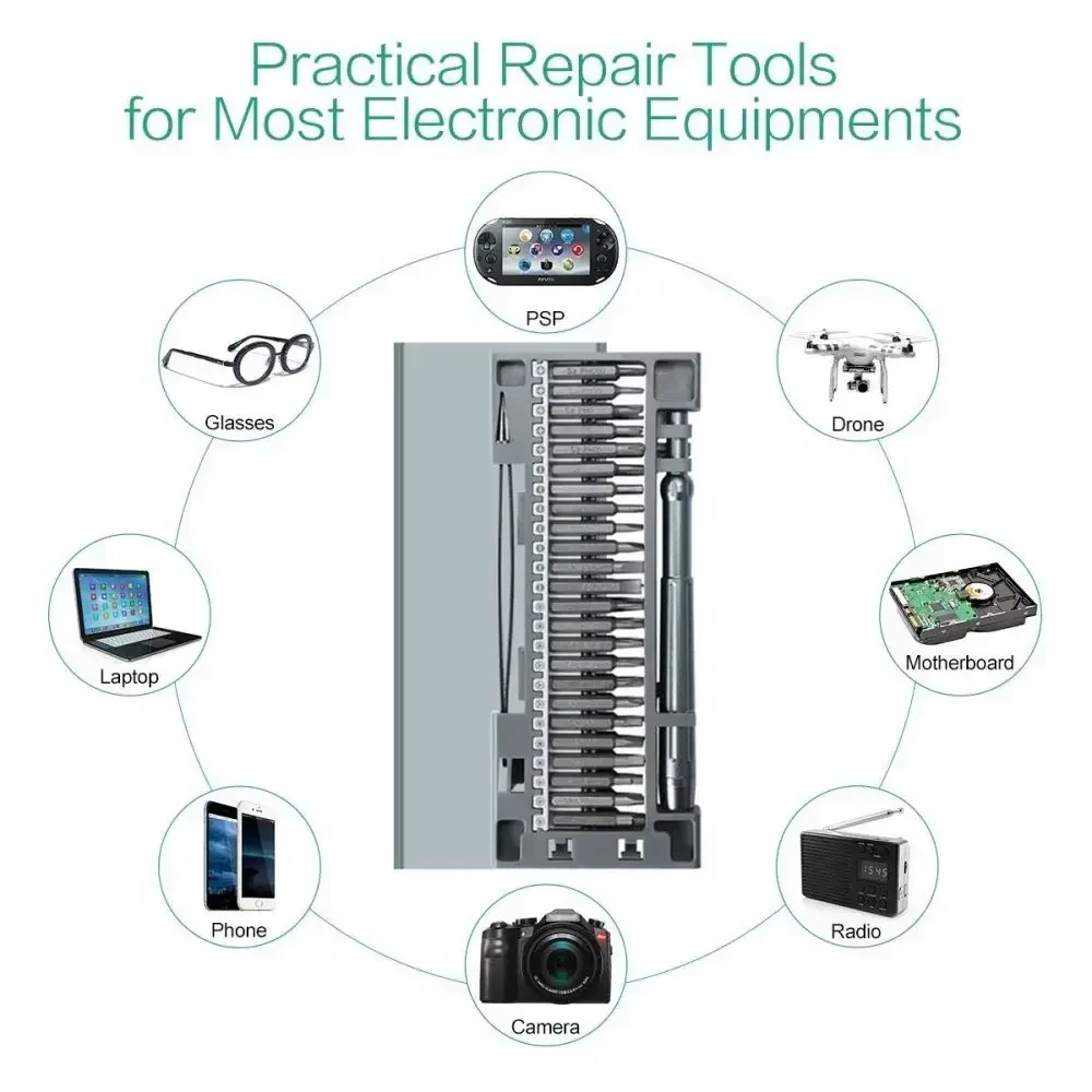 Versatile Precision Set: This comprehensive screwdriver set includes a variety of bits (Phillips, Torx, lathead, Hex, TriPoint, Triangle, Pentalobe, Spanner, Square, tweezer, Spudger) designed for precise repairs on electronics, eyeglasses, PCs, watches, cameras, toys, and models. Ideal for home, office, and DIY projects.
