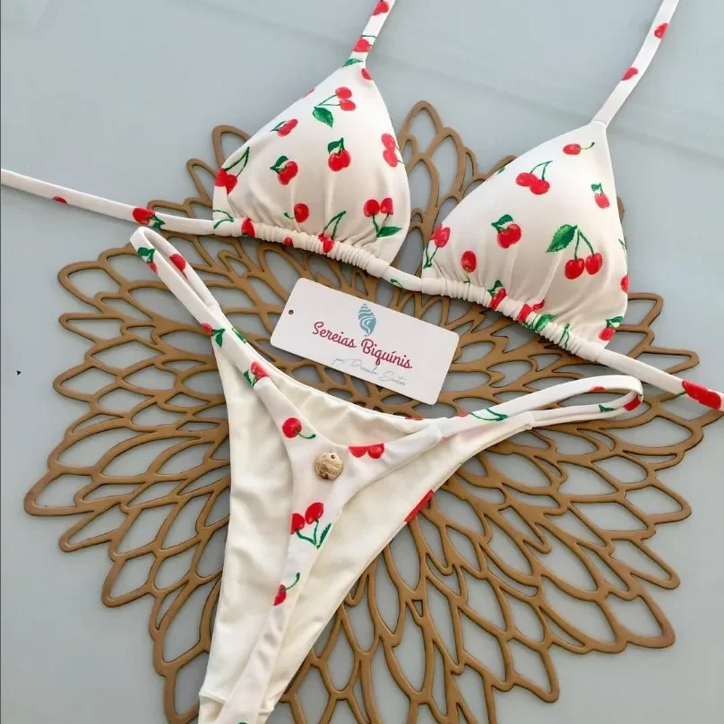Print Sexy Bikini Sets Halter Lace-up Tops Thongs Beach Style Bathing Suit Y2k Swimsuits Women Beachwear