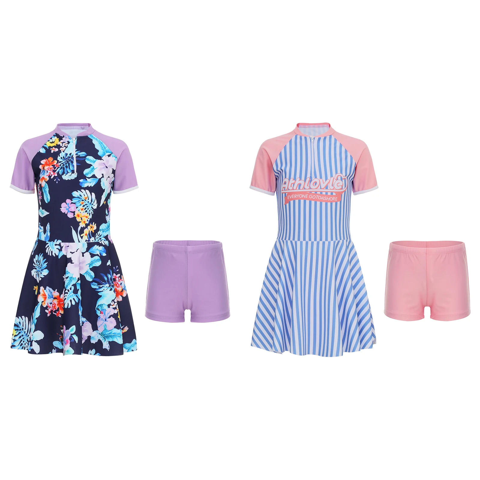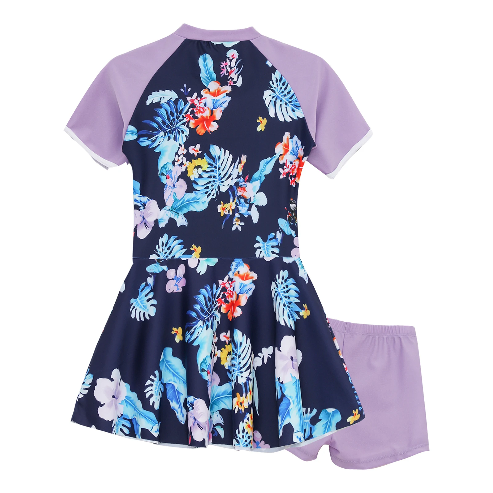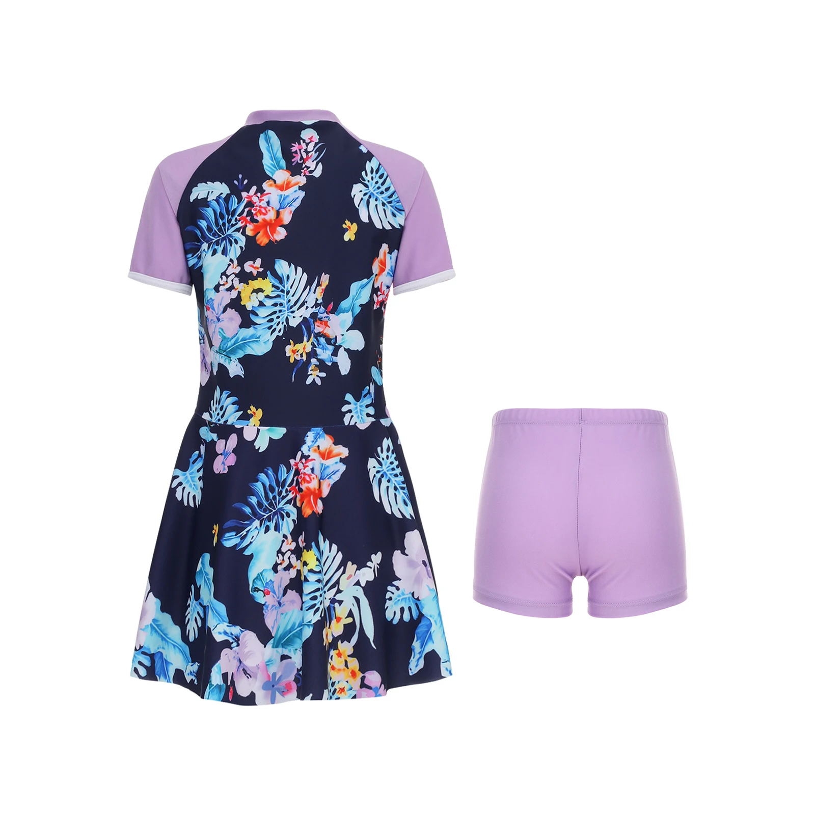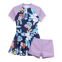Two pieces short sleeve knee length swim dress and shorts set swimwear for girls, beautiful and convenient to wear.