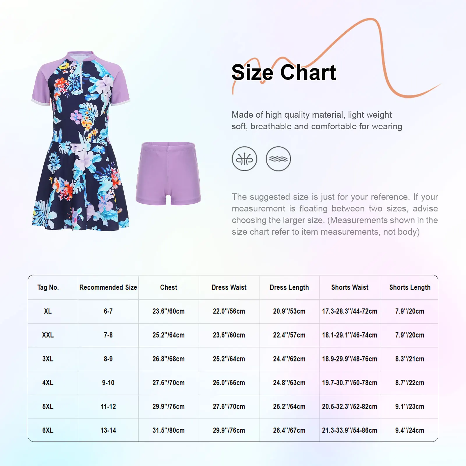 Designed with flounce hem and breathable mesh lining at shorts. And chest pads (4XL-6XL sizes)for adolescent girls.