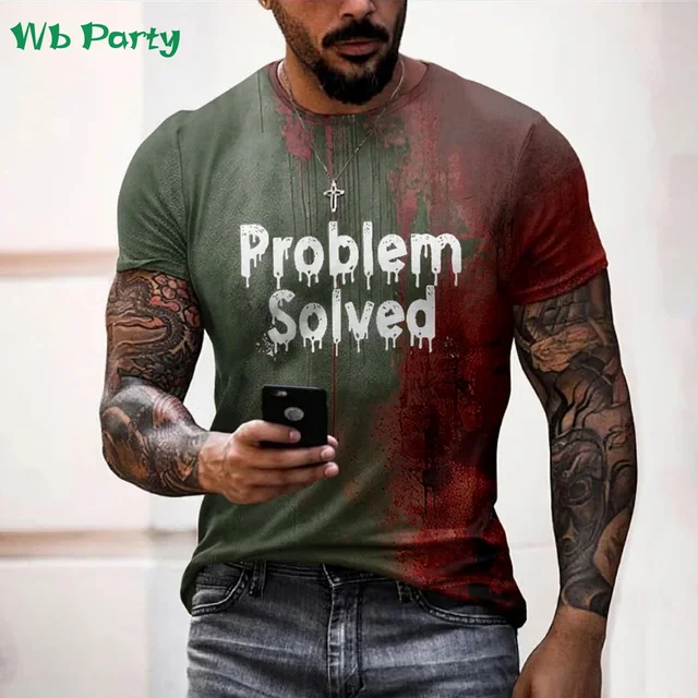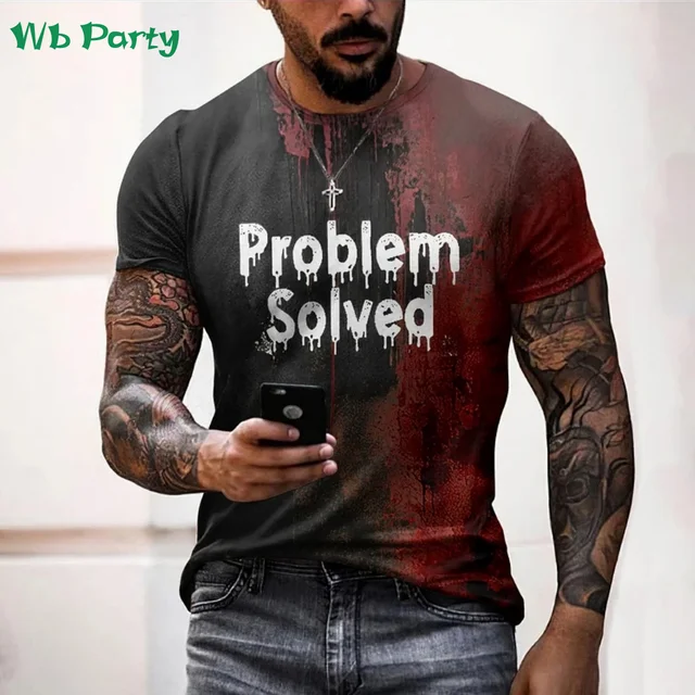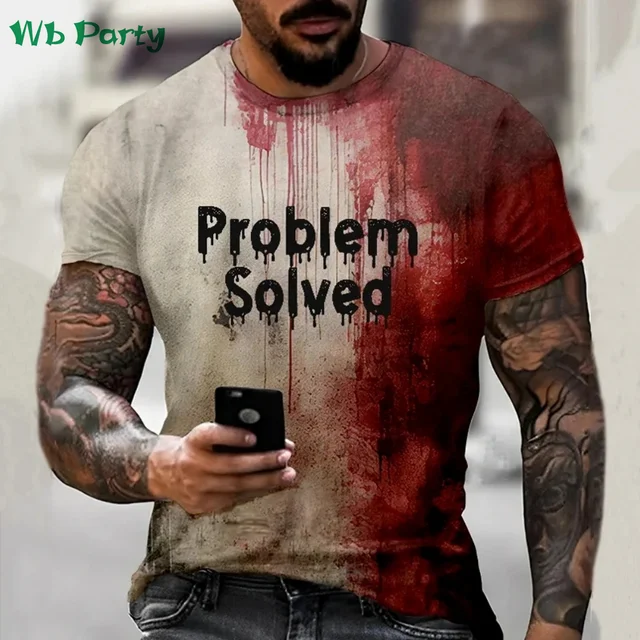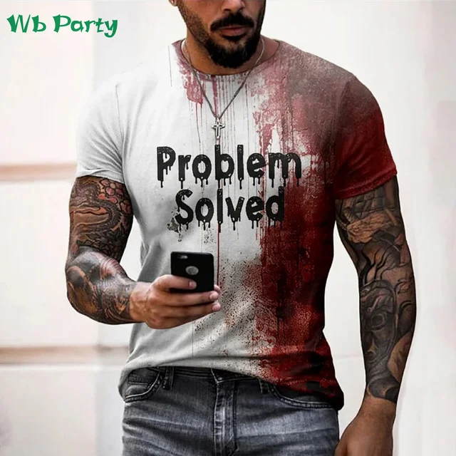 Problem Solved Bloody Print Men’s Clothing Fashion T-shirts for Men Horrible Halloween Short Sleeve