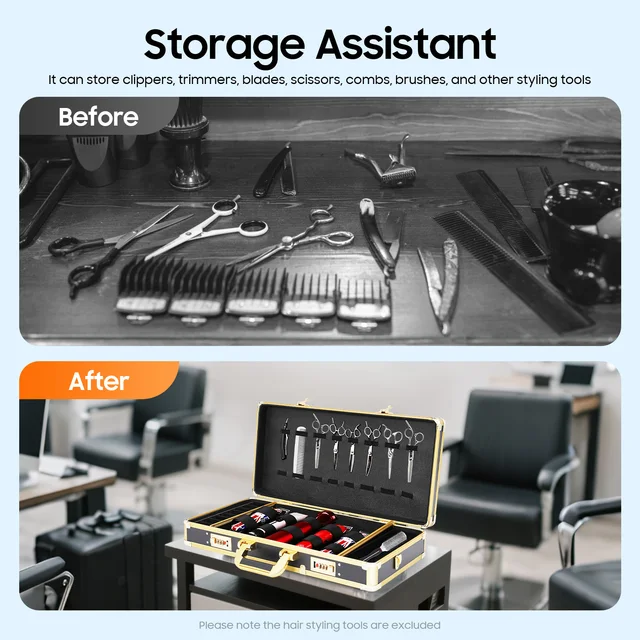 Meet the professional’s choice in tool organization. Crafted from premium aluminum alloy with sophisticated black and gold accents, this barber case blends luxury with durability. Its integrated password lock ensures your valuable clippers and trimmers are securely stored. The spacious, intelligently organized interior accommodates all essentials in a sleek, portable design perfect for the mobile stylist. More than a storage box—it’s a statement of your professionalism.
