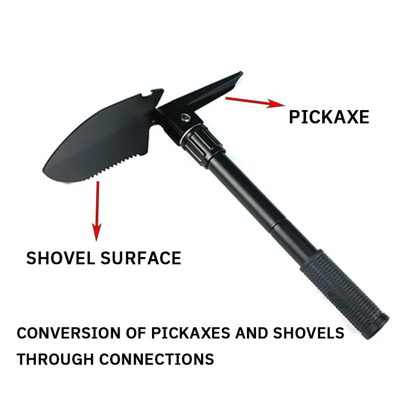 1. Foldable, small size, and easy to carry. After unfolding, one end is a shovel and the other end is a pick.