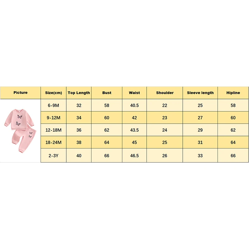 2-3Y Tops Length: 40 Bust: 66 Sleeve: 33 Shoulder: 26 Pants Length: 54.5 Waist: 46.5 Hip: 66 Advised Age: 2-3 Years