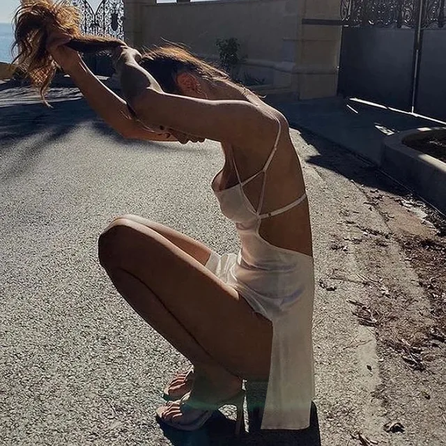 Punk Summer Spaghetti Strap Mini Dress Women Sexy Slit Bodycon Club Party Backless Dresses Chic Satin