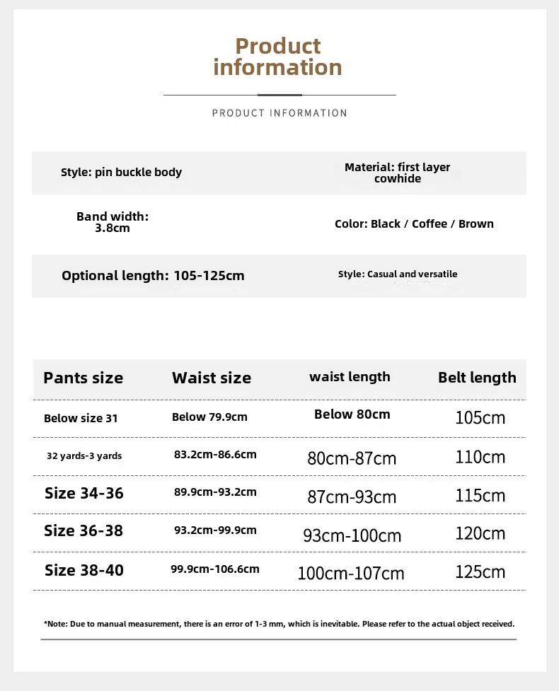 • Genuine Cowhide Belt :Crafted from pure cowhide, this belt offers a luxurious feel and long-lasting durability. Its genuine leather construction ensures it can withstand daily wear and tear.