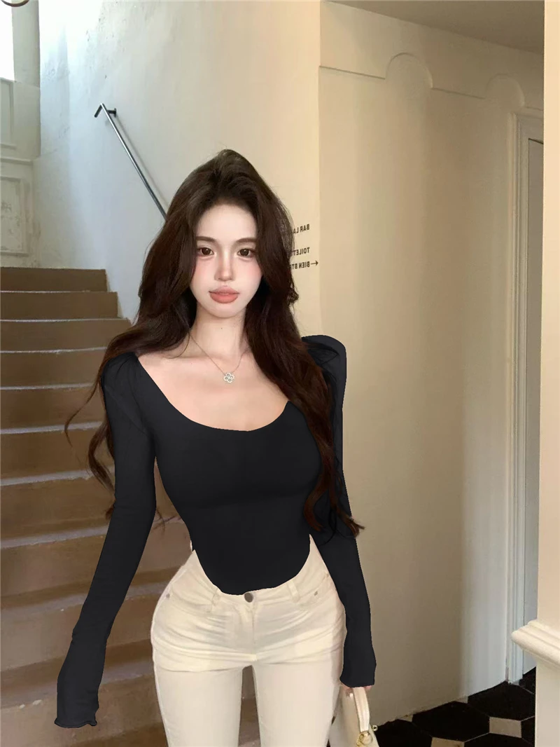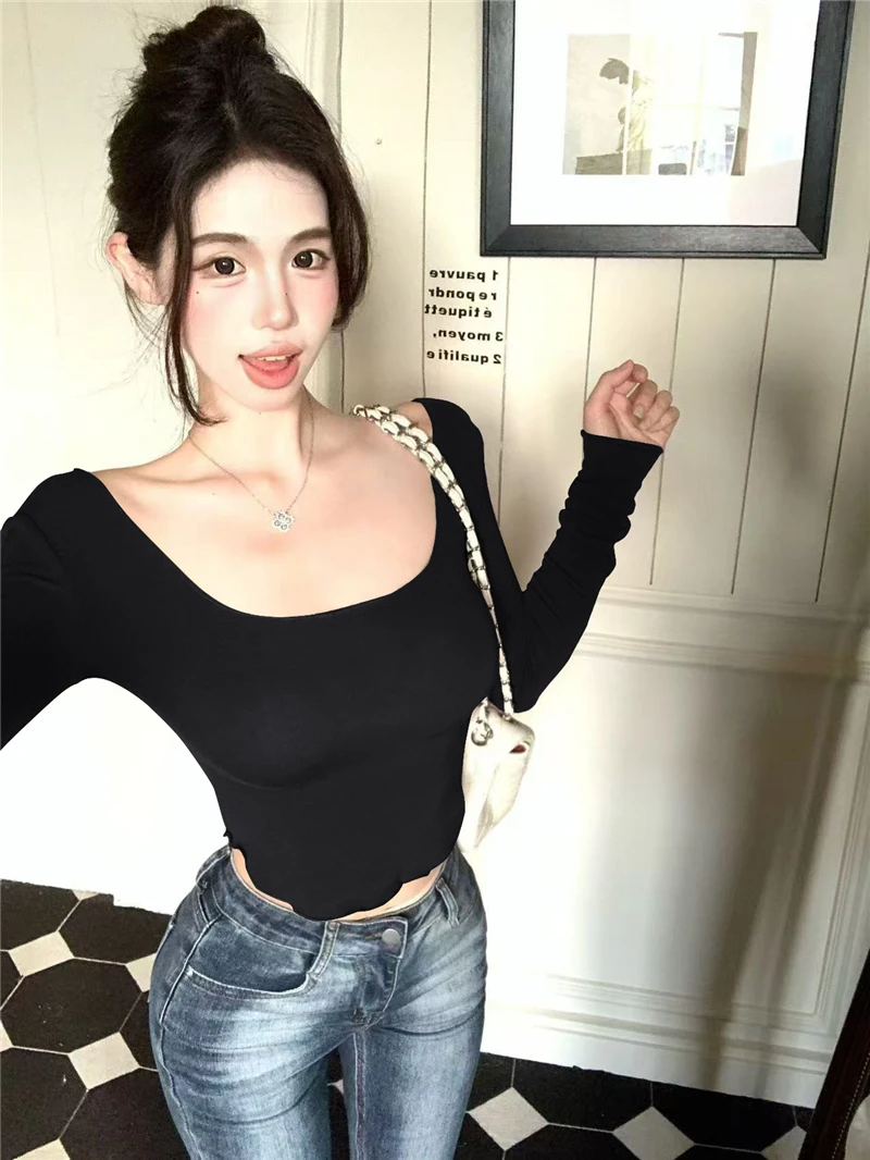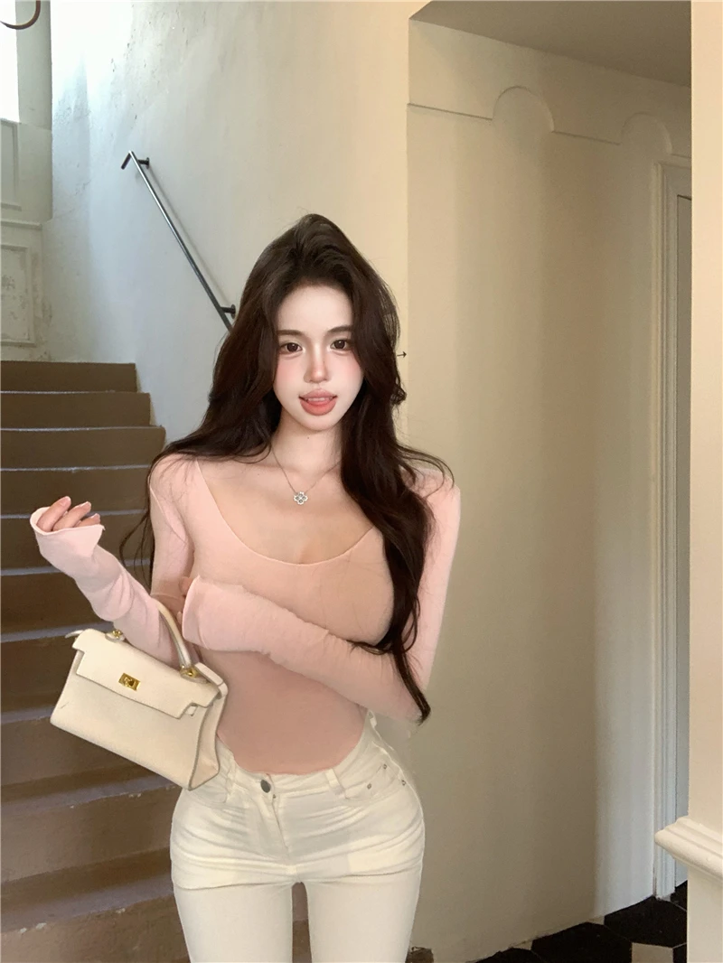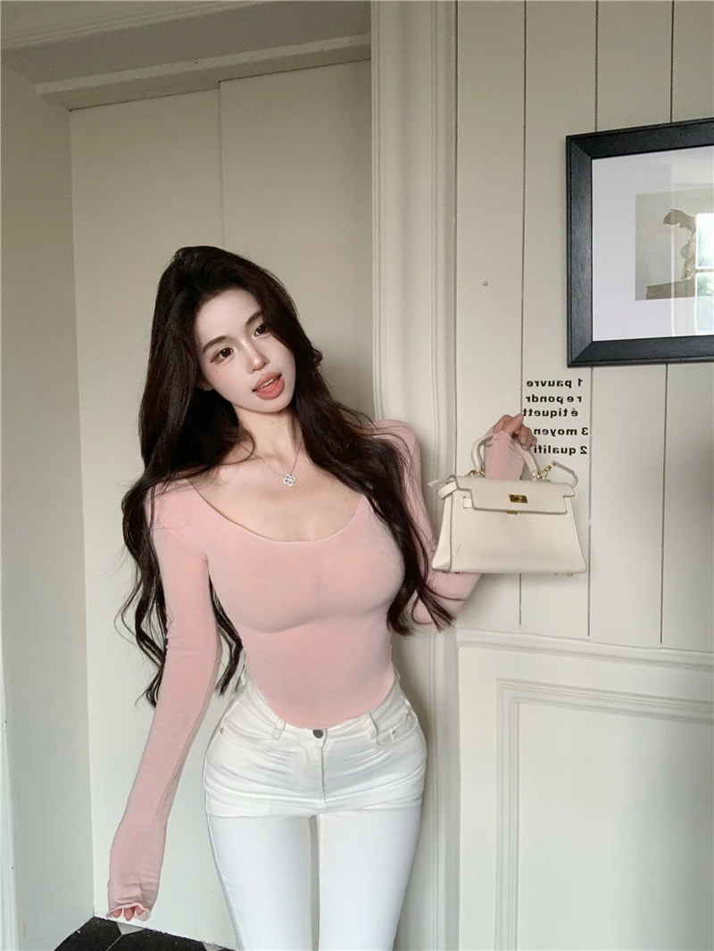 This sexy pink long-sleeve T-shirt features a U-neck design, accentuating your curves and enhancing your chest size. It’s perfect for those who want to make a bold fashion statement.