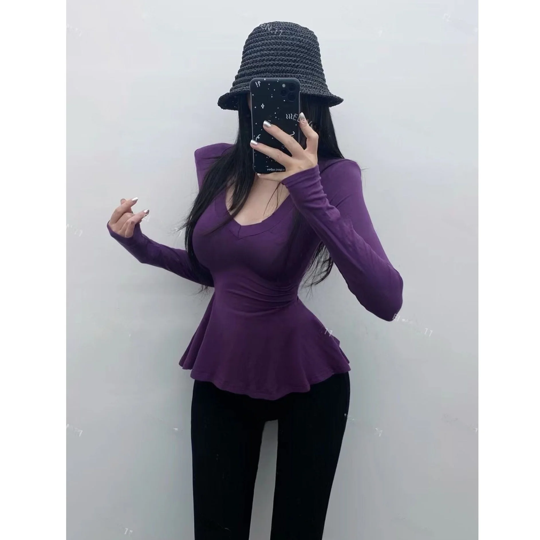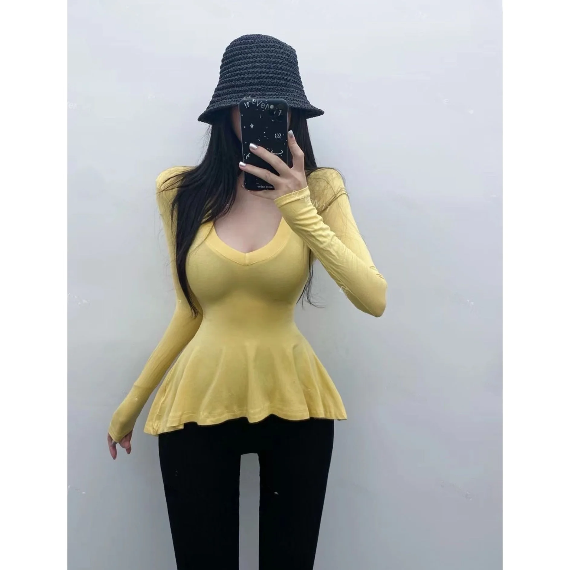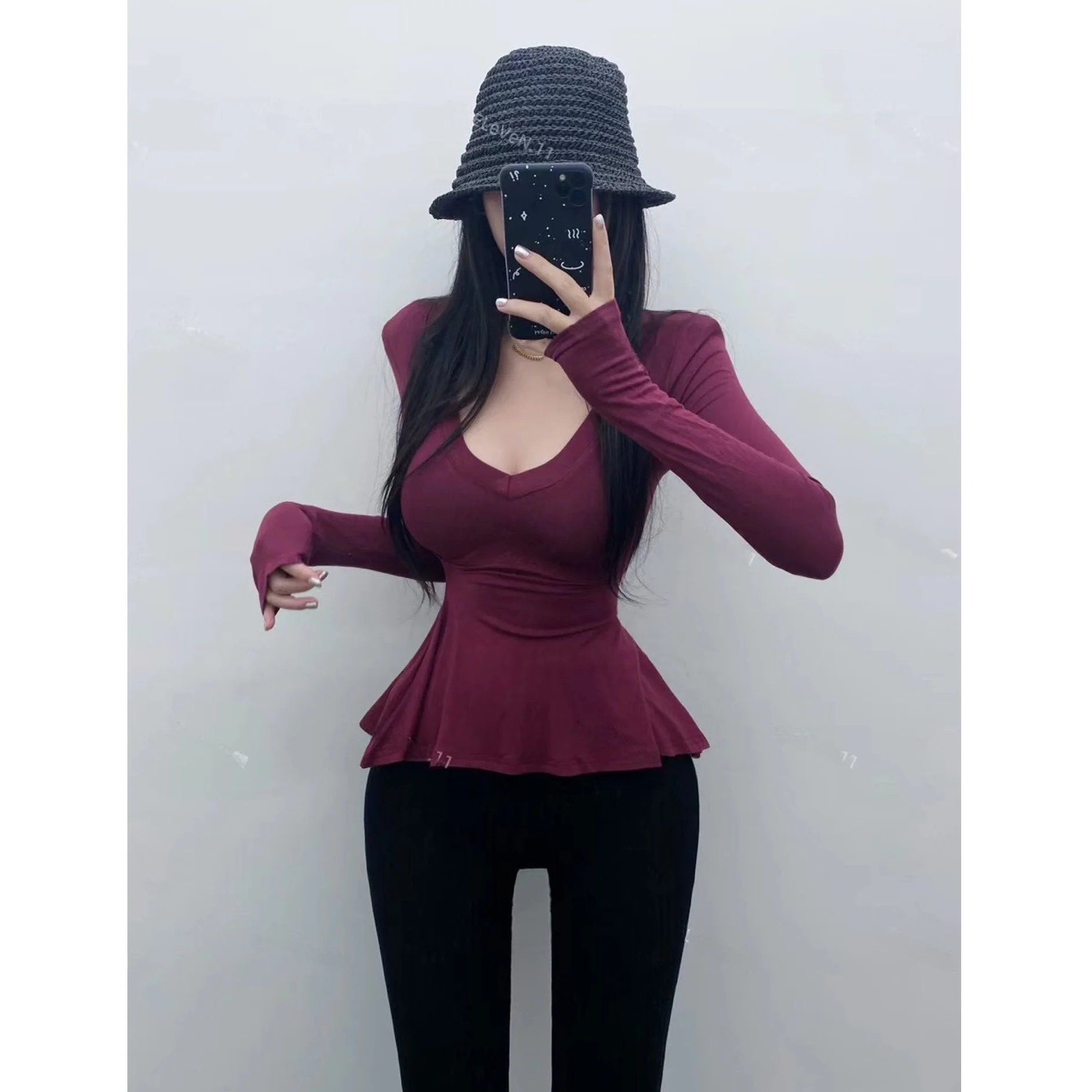 Pure Desire Sexy Long Sve T-irt Women's V-Ne Waist-Cinched Slim Fit Top for Autumn Faionable And Slimming