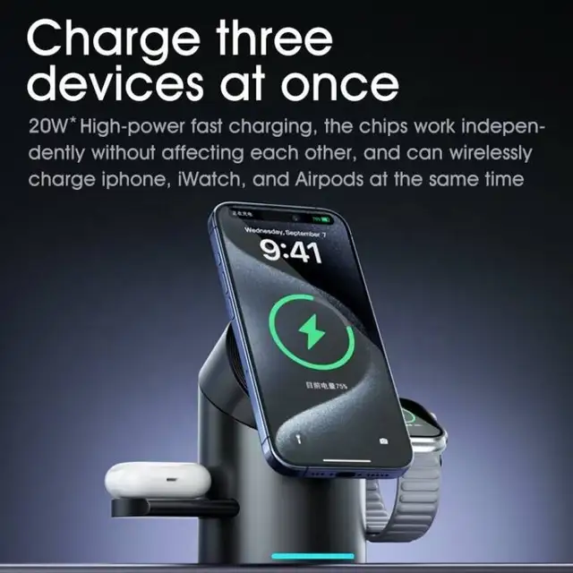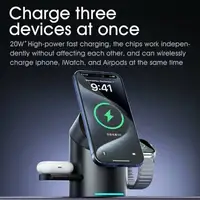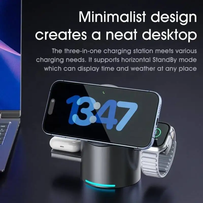 3-in-1 Wireless Charging Station : Charge your iPhone, Apple Watch, and AirPods simultaneously on one sleek platform. The compact cylindrical design saves space while offering efficient wireless charging for all your Apple devices