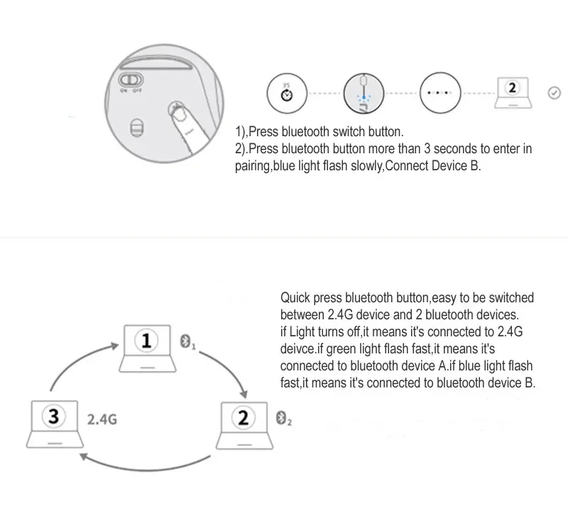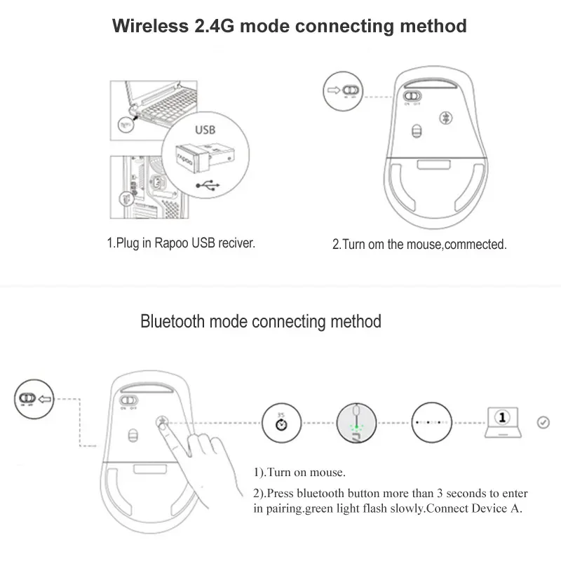 【Easy to Support 3 Device 】Rapoo Bluetooth 3.04.0 Wireless 2.4G technology wireless mouse support 3 devices, two devices by Bluetooth and the third through 2.4GHz USB dongle. With one mouse, you can switch devide easily by simple button. Please note you cannot control three devices at the same time.