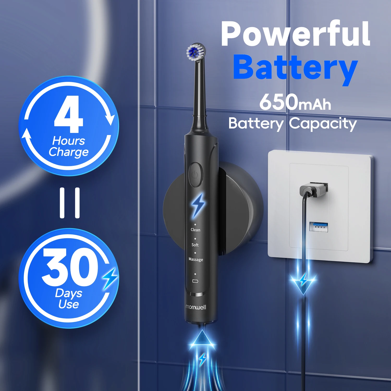 【30-Day Battery Life】Mornwell electric toothbrush features a 4-hour quick charge battery that lasts up to 30 days, far outperforming other toothbrushes on the market. you can always use this toothbrush while traveling or on a business trip