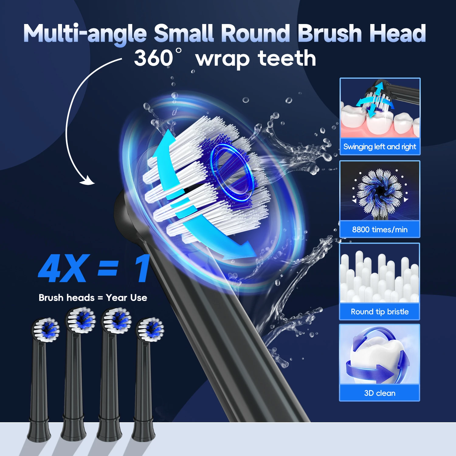 【4 Replacement Brush Heads Last for 1 Years 】Mornwell rotating electric toothbrush comes with 4 DuPont brush heads, which you can use for 1 years. You can share a toothbrush, and different toothbrush heads of different family members.