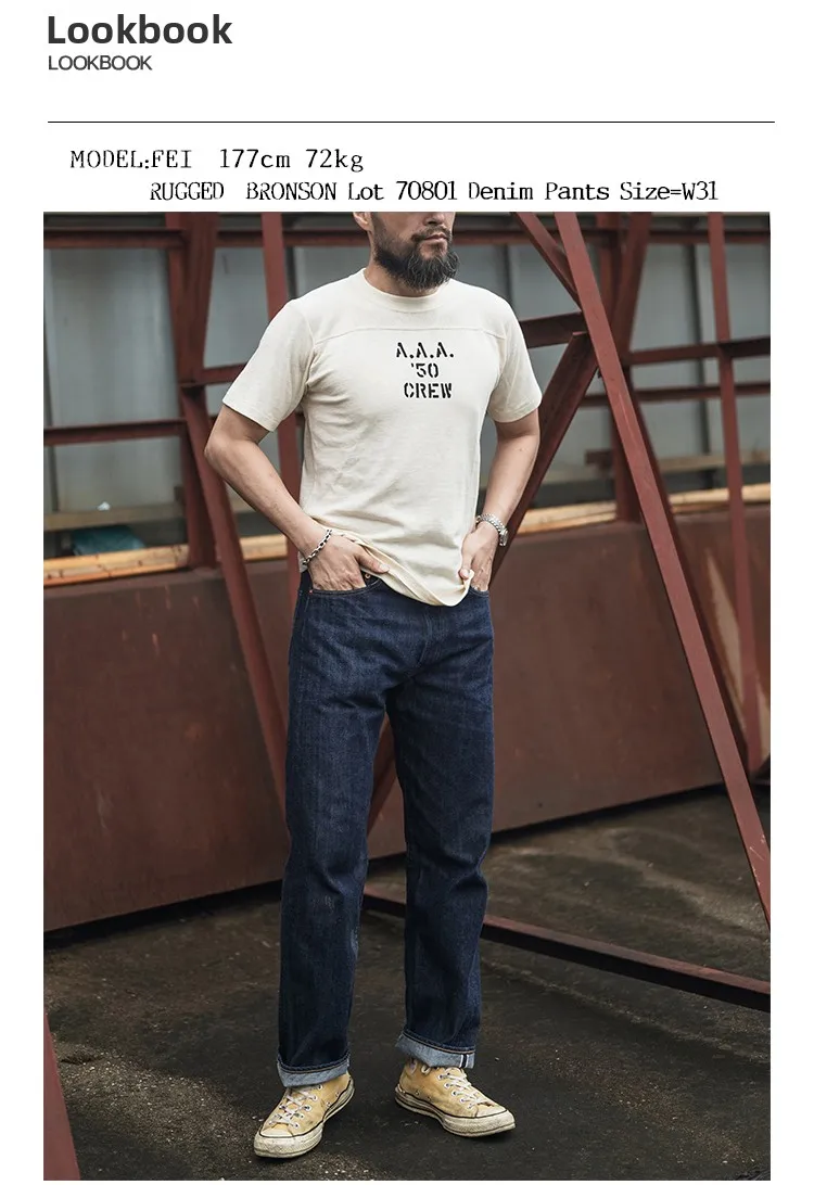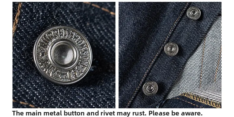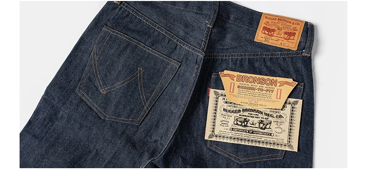 Rugged Bronson’s BRONSON jeans pay homage to the 70s with a true blue denim hue and straight-leg cut, offering a vintage aesthetic.