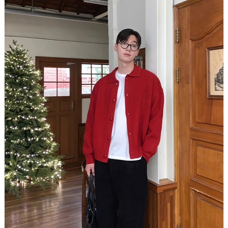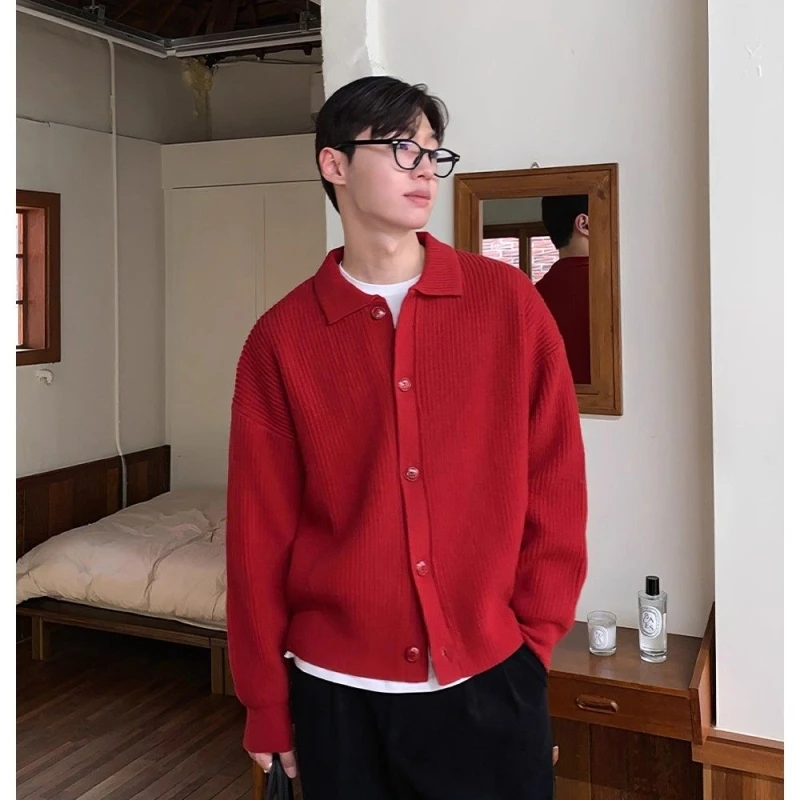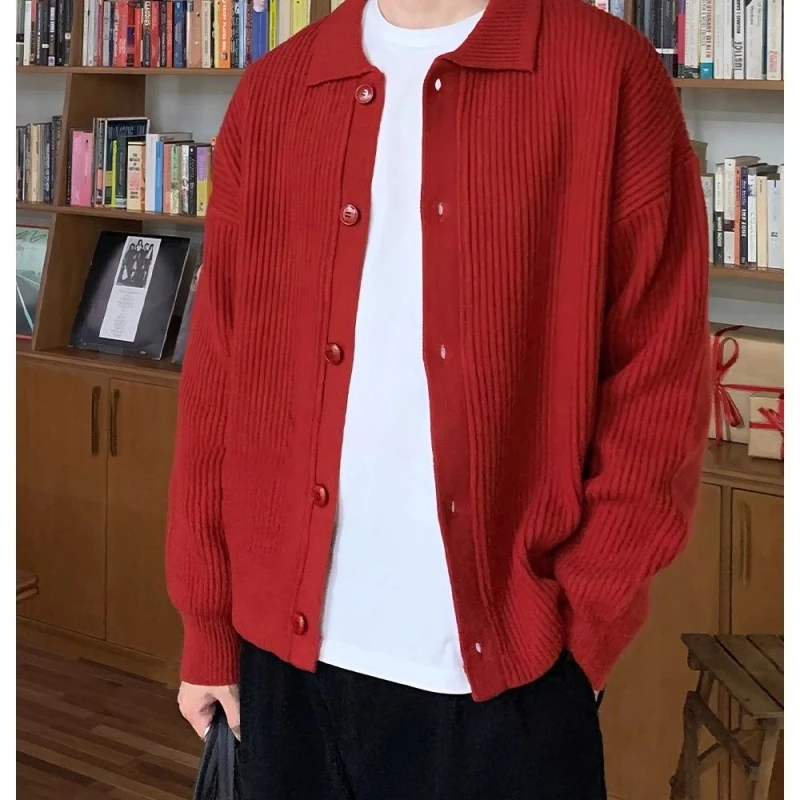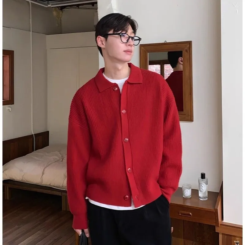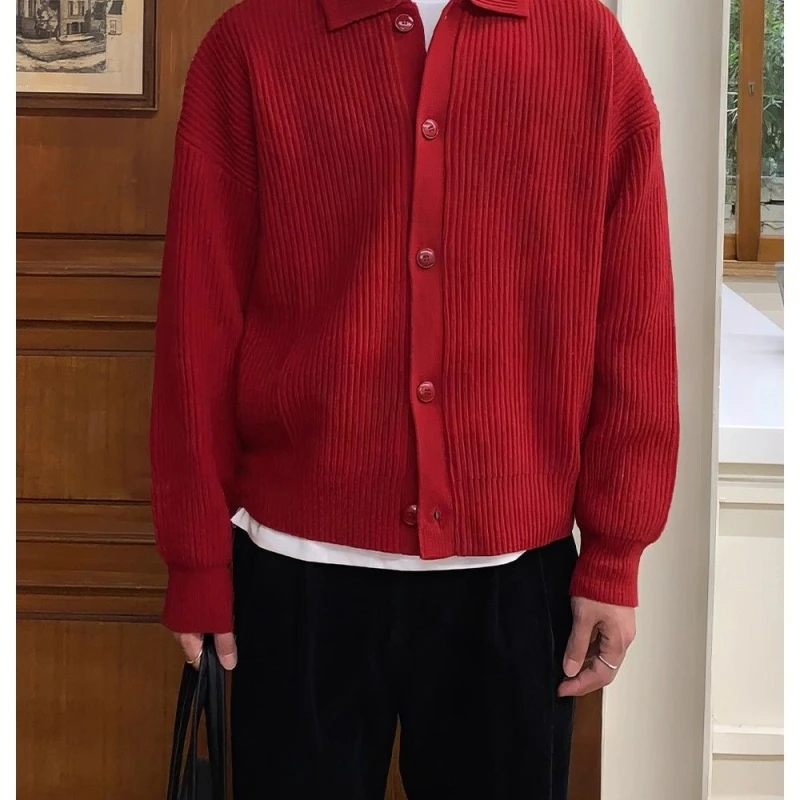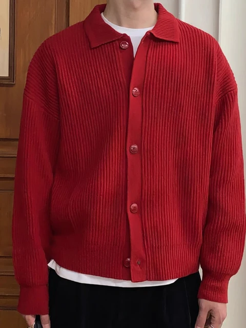 Red Knitted Sweater Carrot Sle Men's Spring Autumn Korean Sle Dongdaemun 2025 Turn-down Collar Birth Year Outerwear