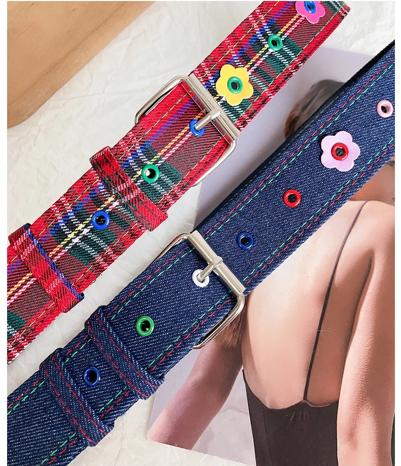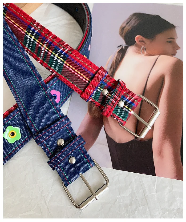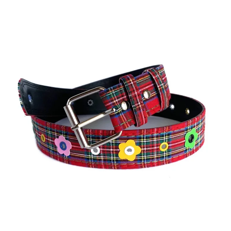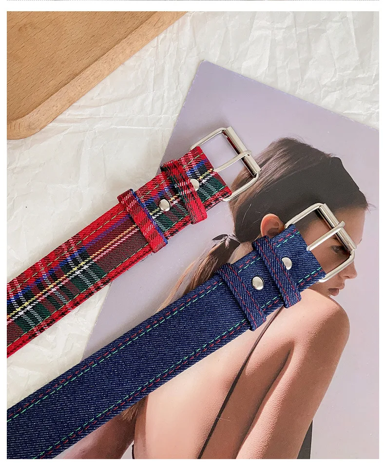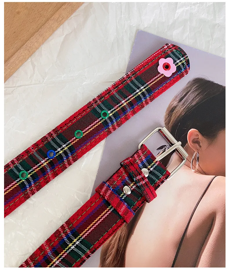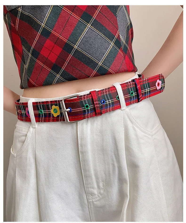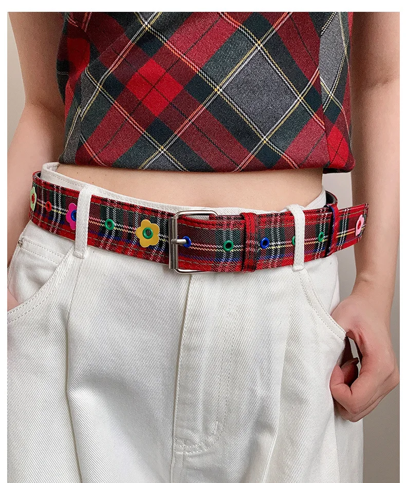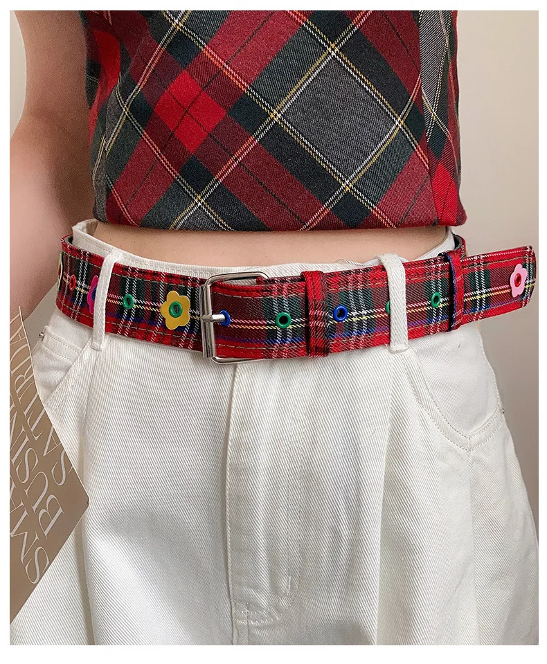 Red Y2k Girl Belt Fashion Personality Blue Plaid Design Pin Buckle Girdle Hip-hop Trend Cloth Waistband