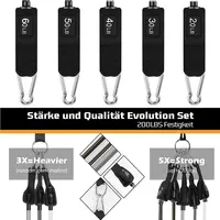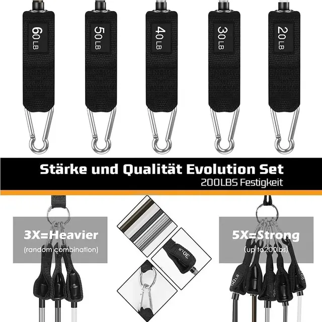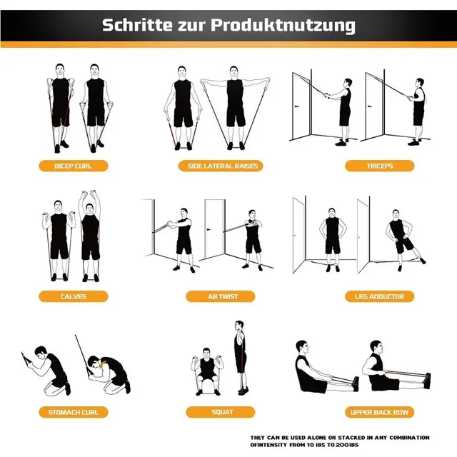 1、The resistance bands can be used alone stacked in any combination to a maximum equivalent of 150 lbs. (10 lbs. 20 lbs. 30 lbs. 40 lbs. 50 lbs.) or 200 lbs(20 lbs. 30 lbs. 40 lbs. 50 lbs. 60 lbs.)