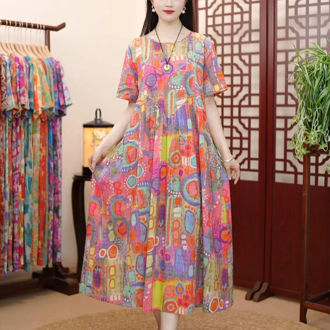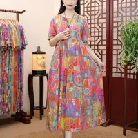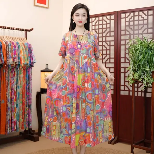 Short Sleeve Cotton Linen Vintage Print Summer Long Dresses For Women 2025 Casual Loose Holiday Ladies Dress Elegant Clothes