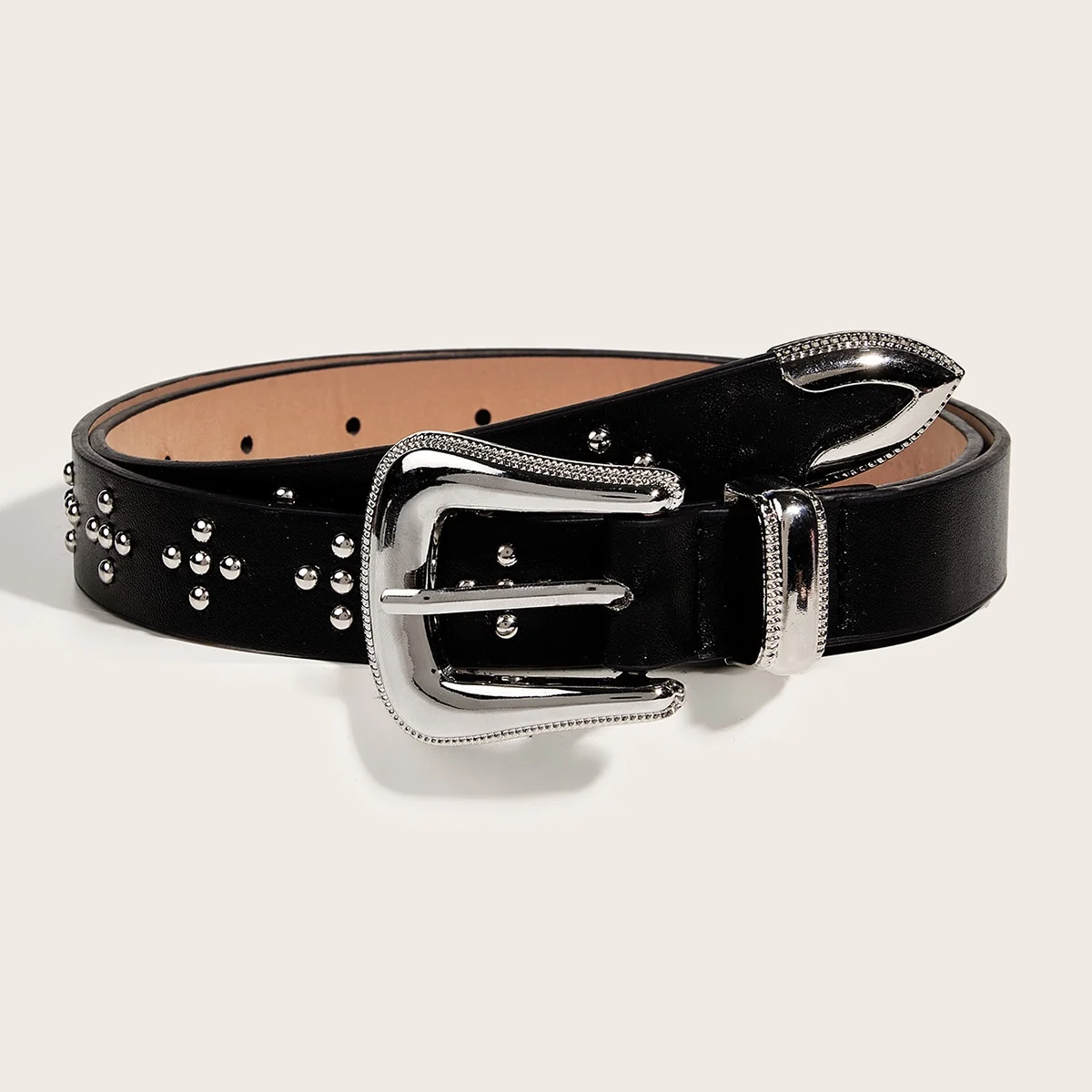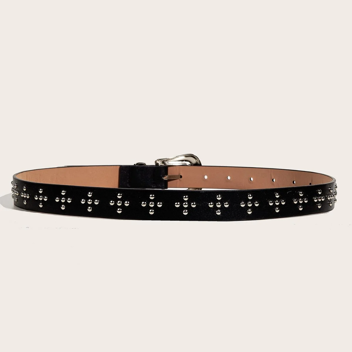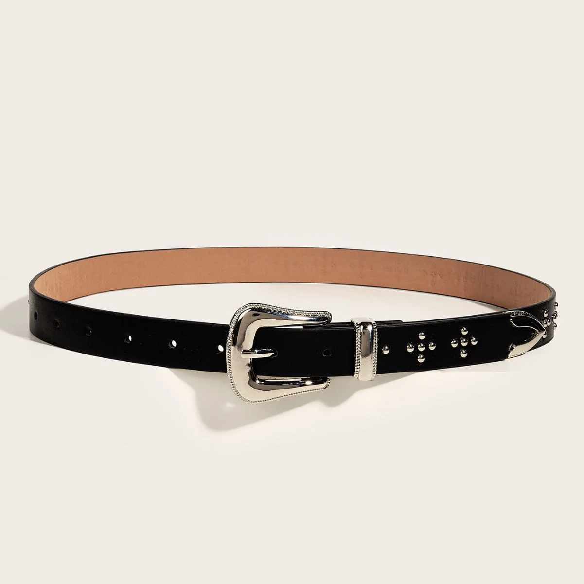 The belt features a fashionable rivet element, adding a modern touch to any outfit, whether it’s a coat or a dress.