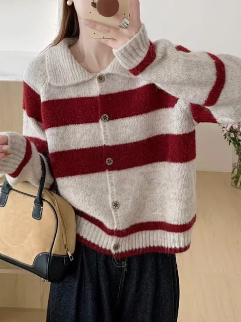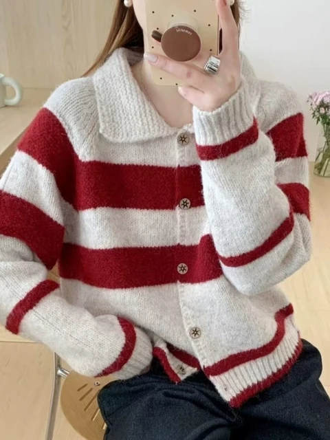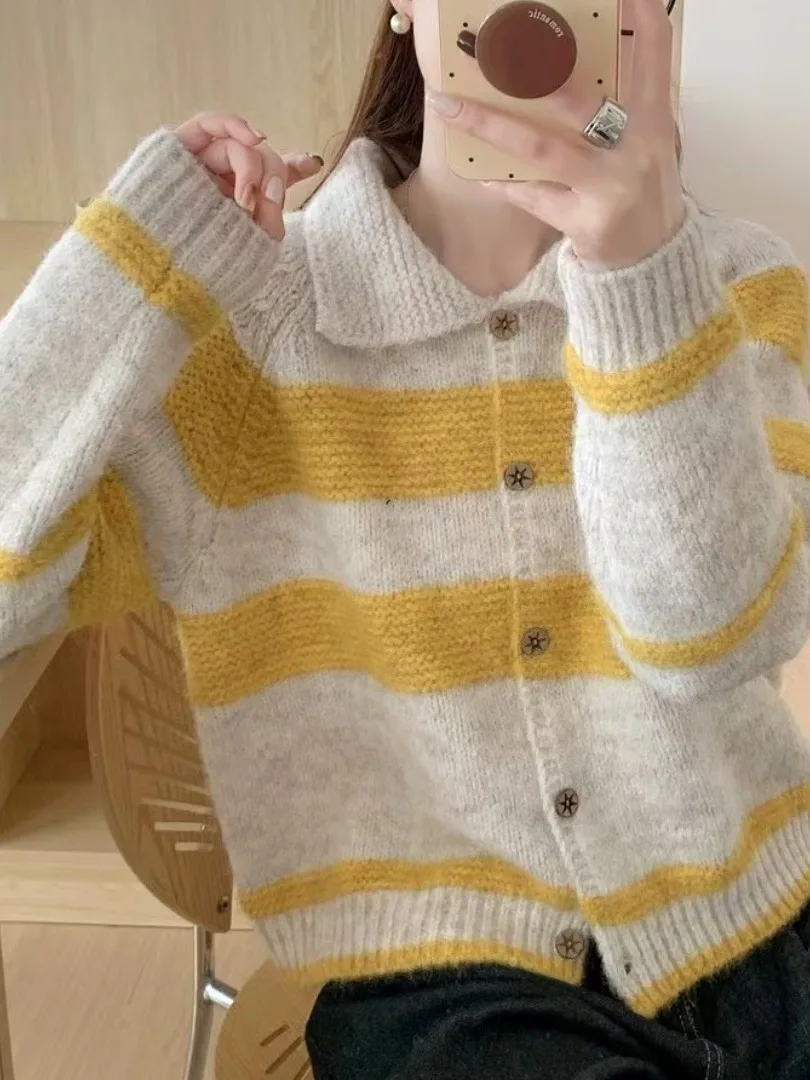 Retro Korean Striped Loose Women’s Knitwear Cardigan Casual Sle Long Sve Collared Sweater Autumn