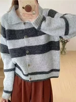 Retro Korean Striped Loose Women's Knitwear Cardigan Casual Sle Long Sve Collared Sweater Autumn Winter Faion Small Size