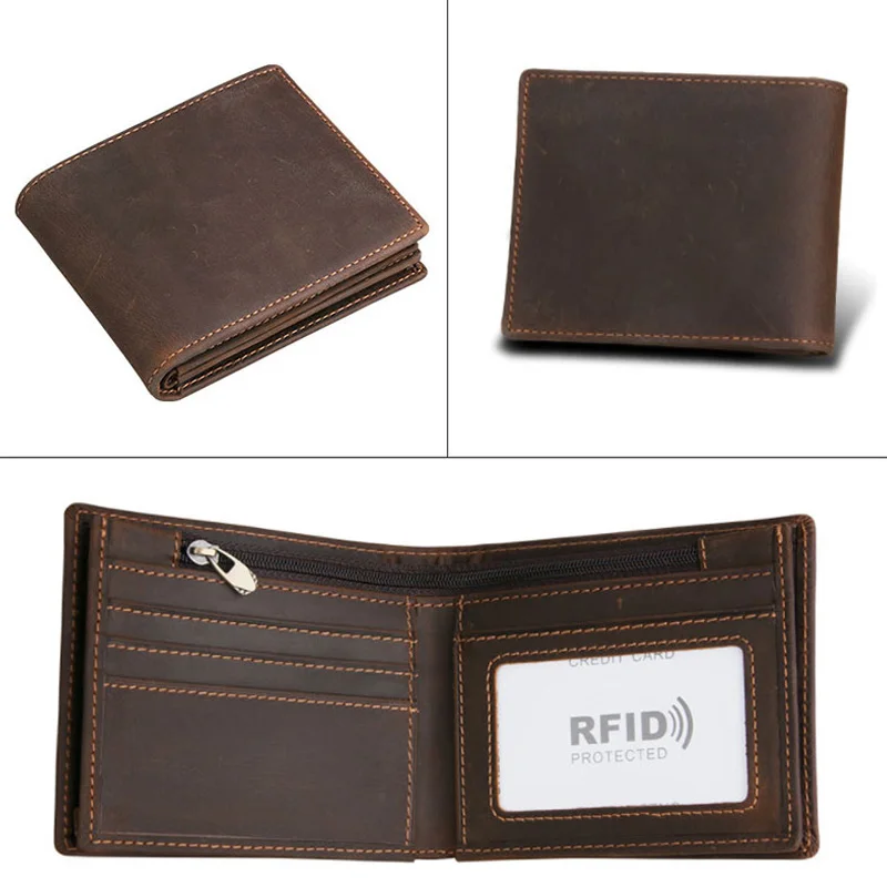 Original price was: 61.78$.30.89$Current price is: 30.89$.RFID Blocking Men’s Oil Wax Skin Wallet Man Vintage Cow Genuine Leather Wallet Male Handmade Billfold