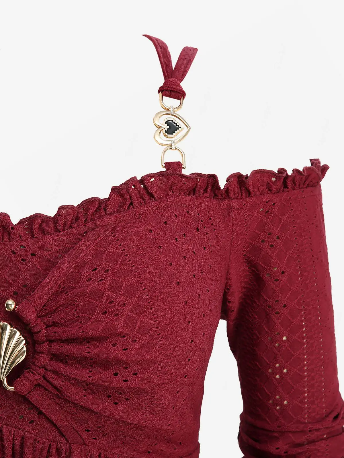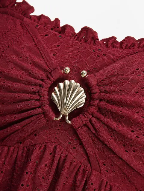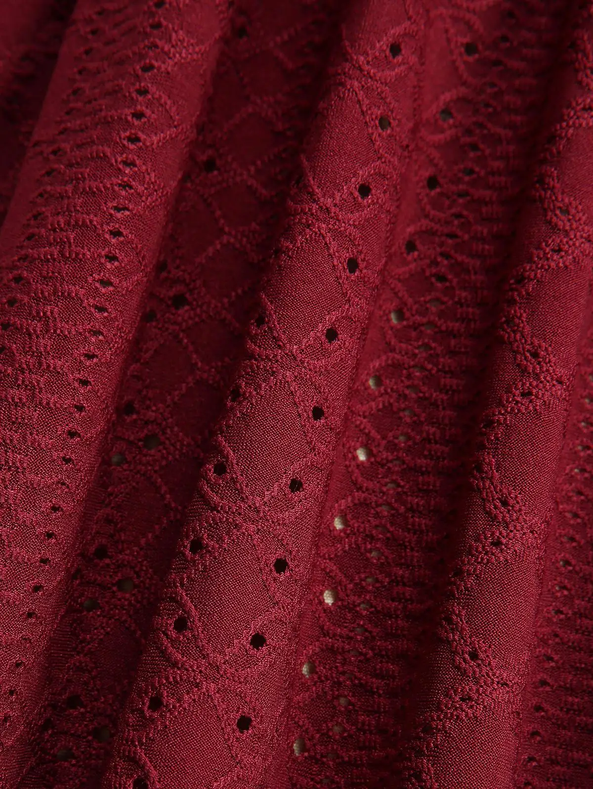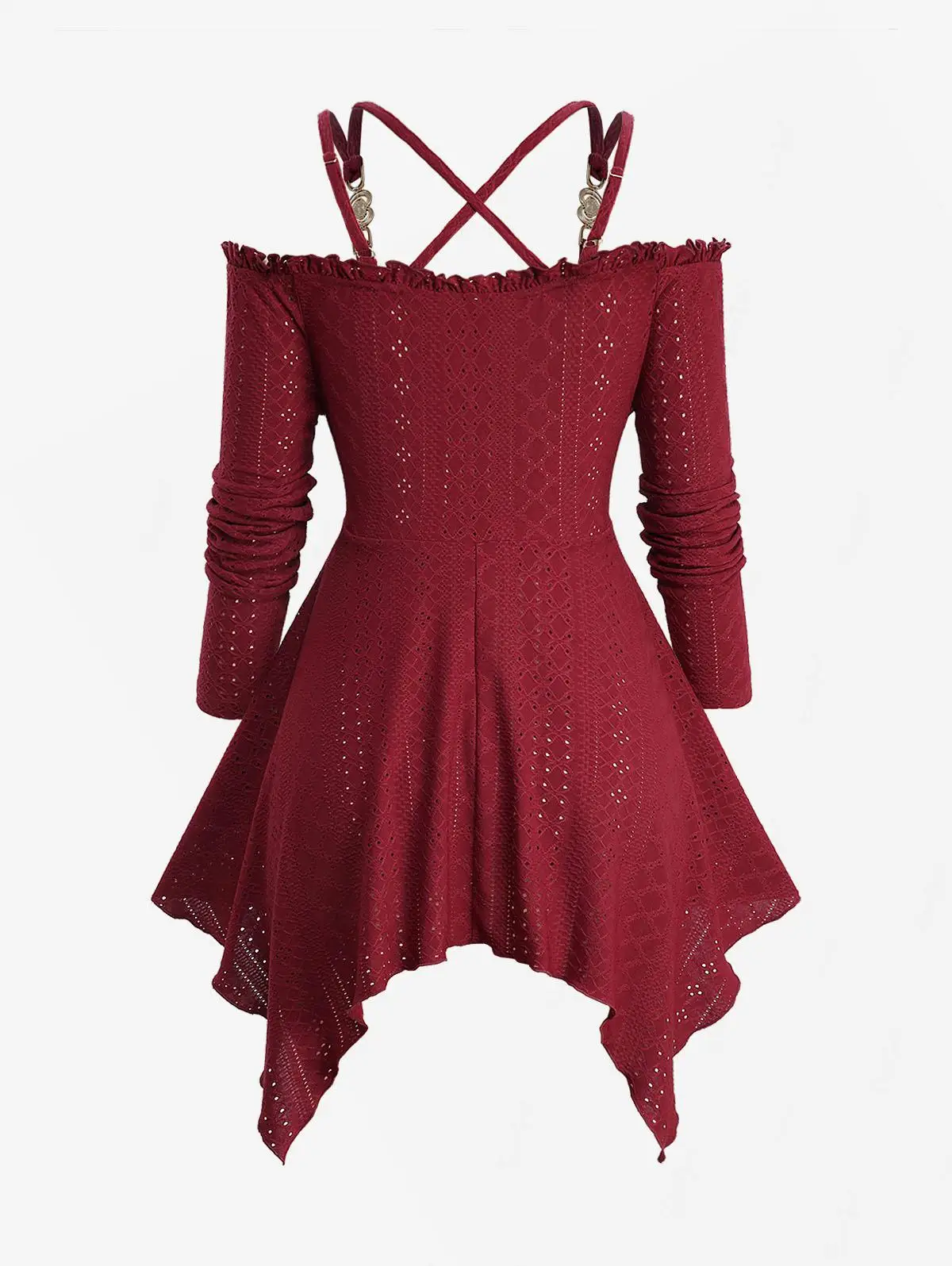 Deep Red Plus Size Pointelle Hollow Out Jacquard Embroidery Shell Buckle Crisscross Solid Handkerchief Long Sleeves Top
