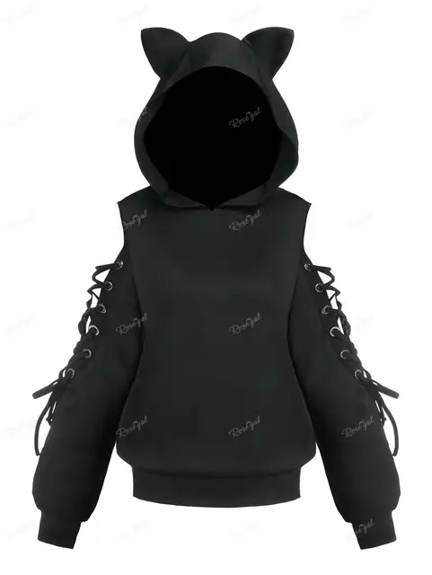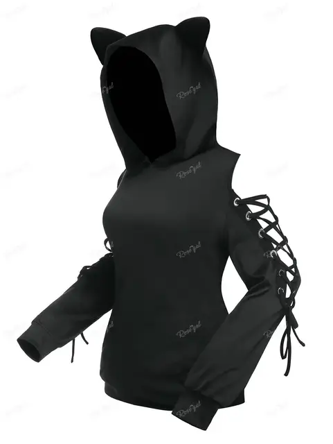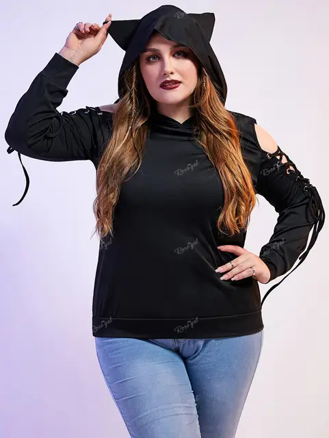 Plus Size Lace Up Sleeves Ears Pullover Hoodie