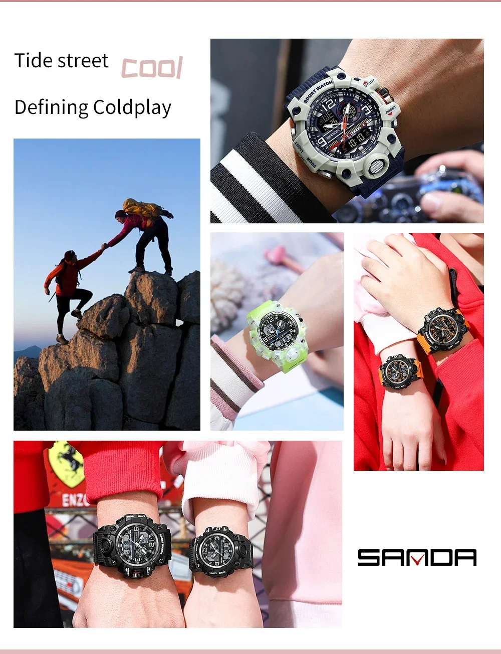 SANDA 3353 LED Sports Waterproof Electronic Shockproof Lady Quartz Wristwatches Dual Display Digital Watch for Boy Girl Children