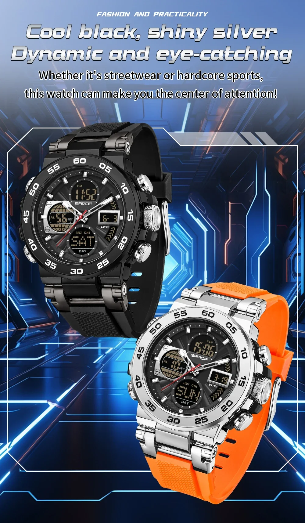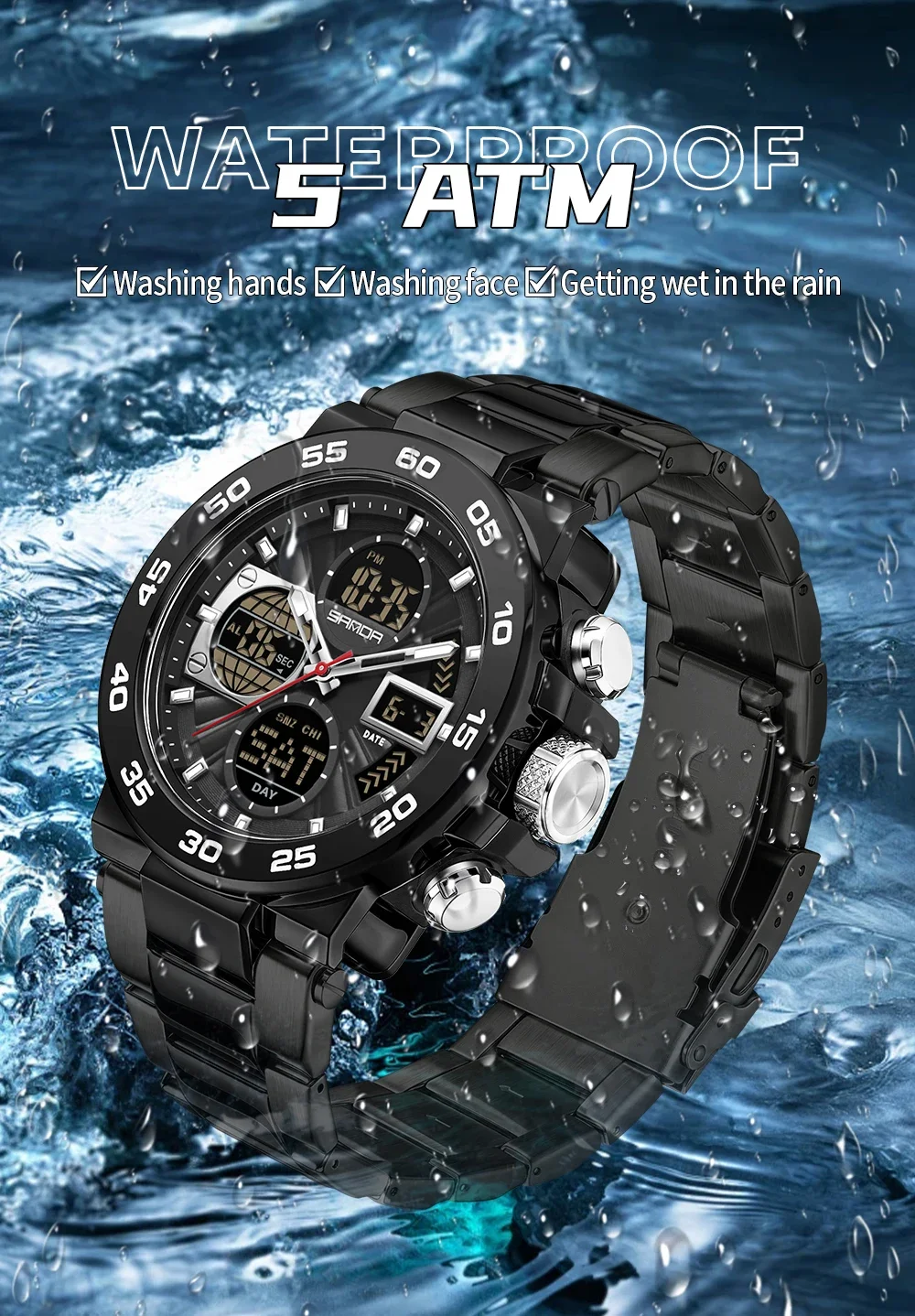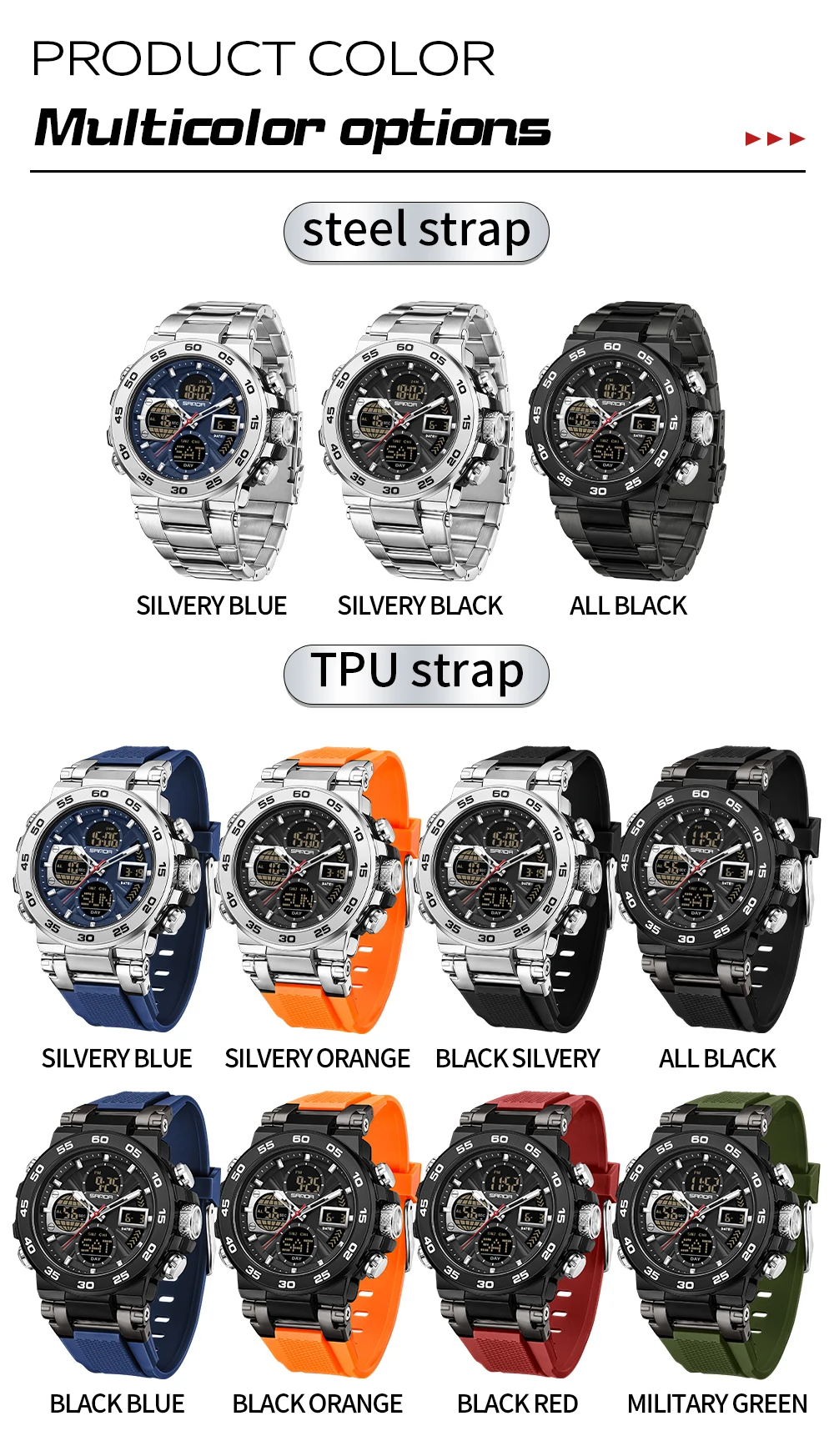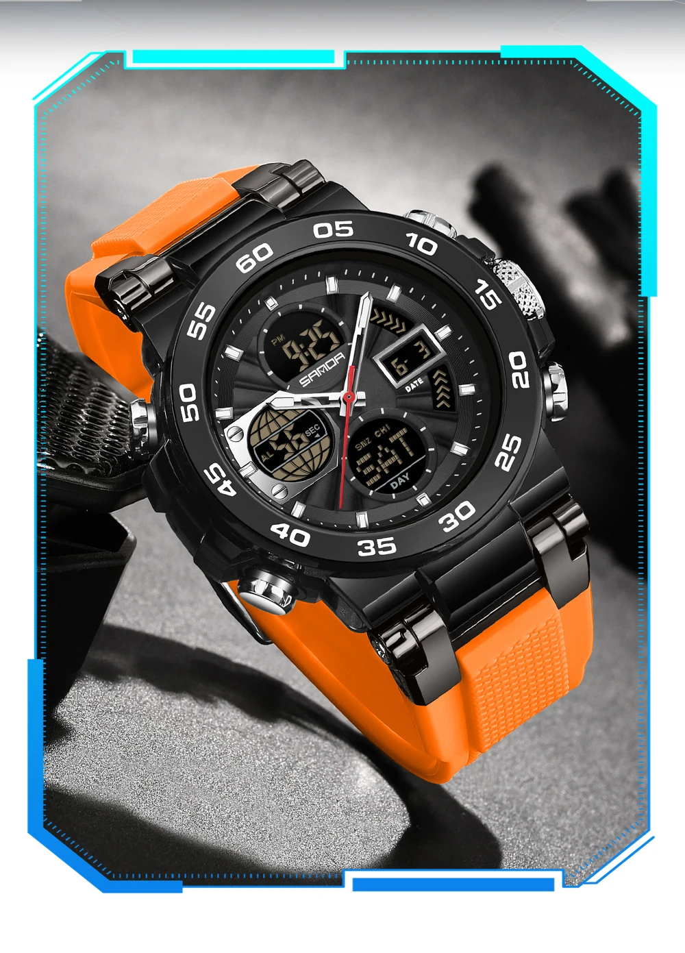 Be the first to review “SANDA 6312 Luxury Tape Sports Watch Dual Display Dual Chip 5ATM Waterproof Multi functional Men’s”
