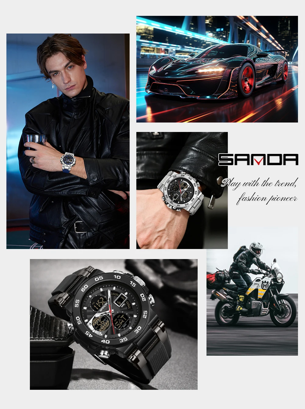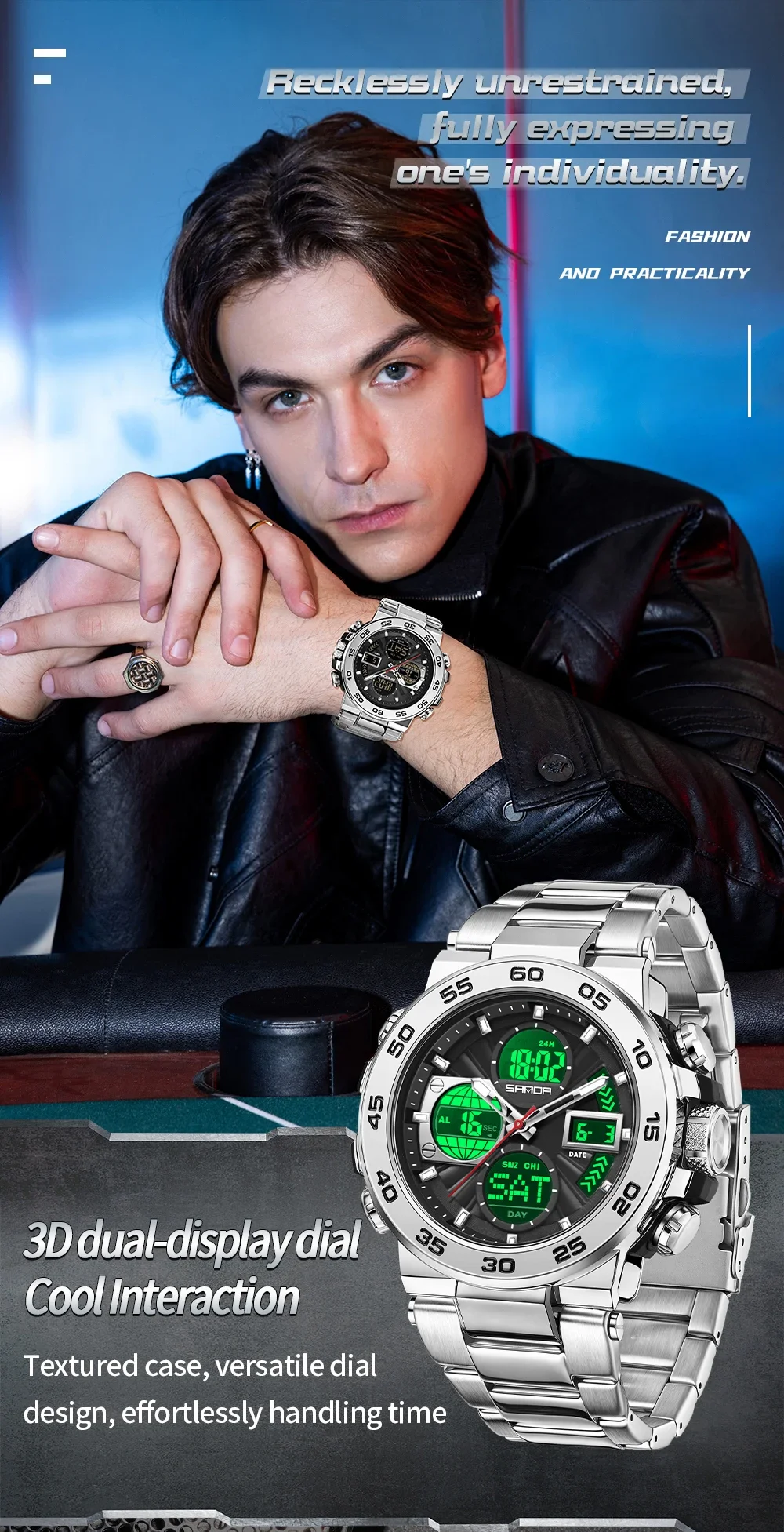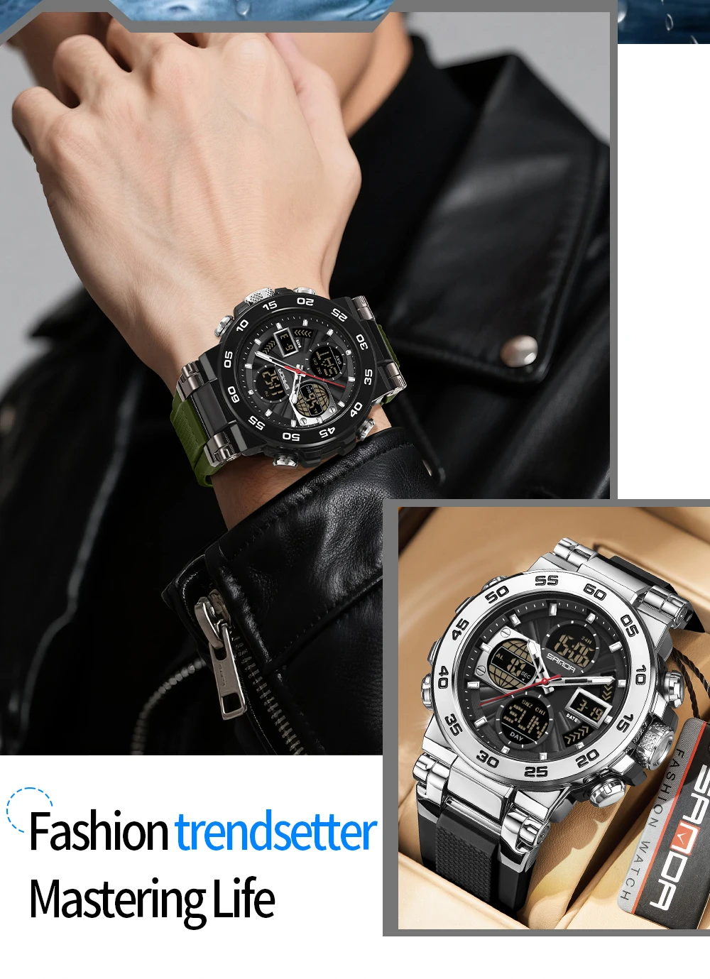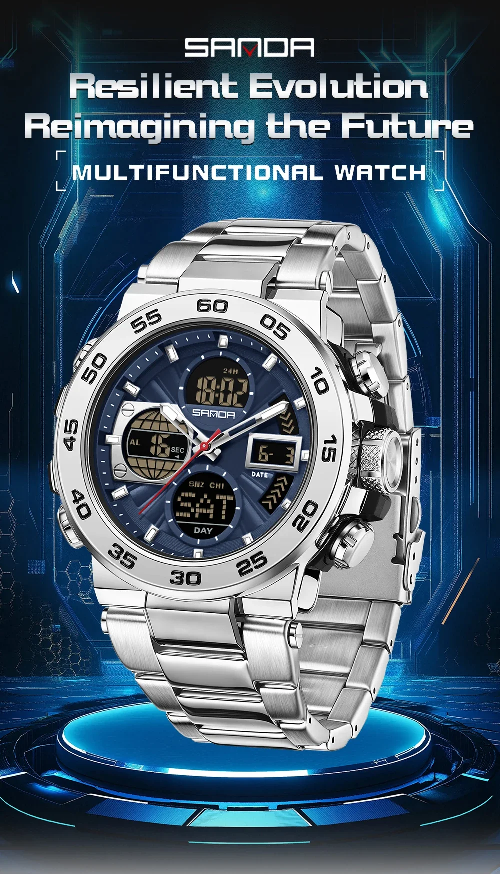 Be the first to review “SANDA 6312 Luxury Tape Sports Watch Dual Display Dual Chip 5ATM Waterproof Multi functional Men’s”