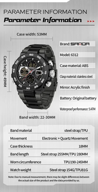SANDA 6312 Luxury Tape Sports Watch Dual Display Dual Chip 5ATM Waterproof Multi functional Men’s