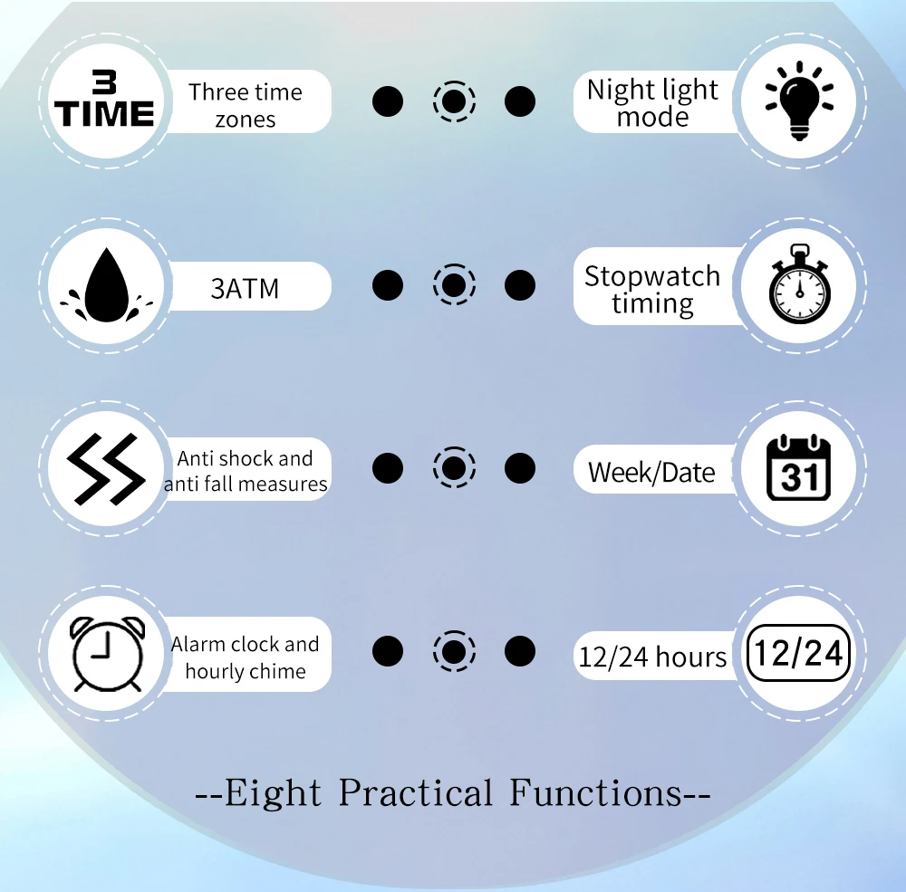 Model Number9103FeatureShock Resistant,Led Display,Luminous,Auto Date,Chronograph,Complete Calendar,Multiple Time Zone,Water-Resistance,Alarm,swim,Week Display