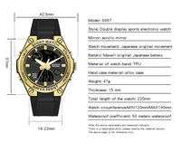 Model Number6067FeatureSTOP WATCH,Back Light,Shock Resistant,LED display,Repeater,Luminous,Auto Date,Chronograph,Complete Calendar,Perpetual Calendar,Water Resistant,Alarm,swim,Week Display