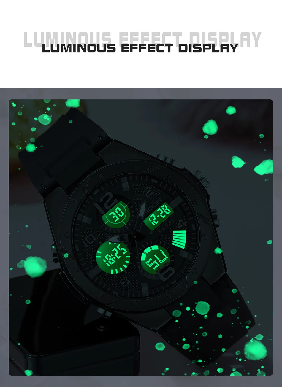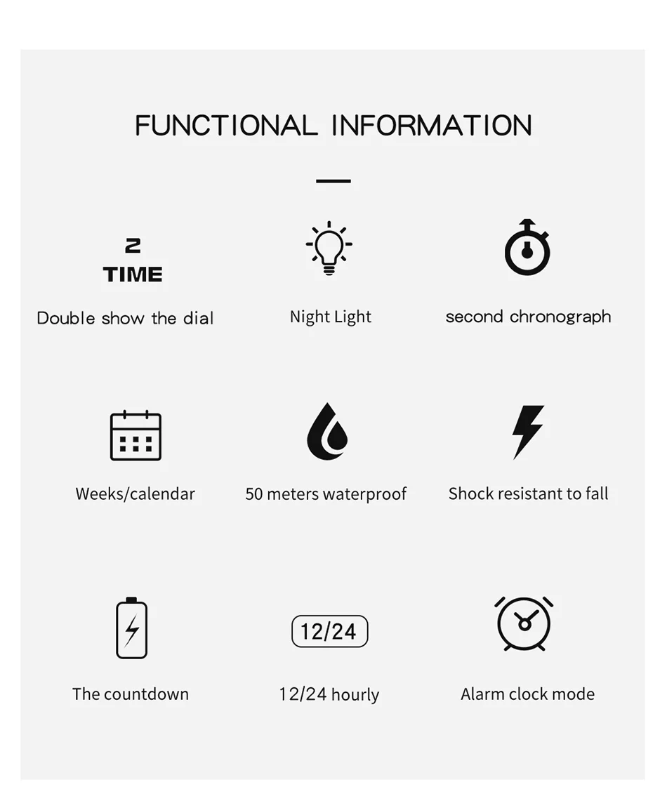 STOP WATCH,Back Light,LED display,Auto Date,Chronograph,Complete Calendar,Water Resistant,Alarm,Week Display