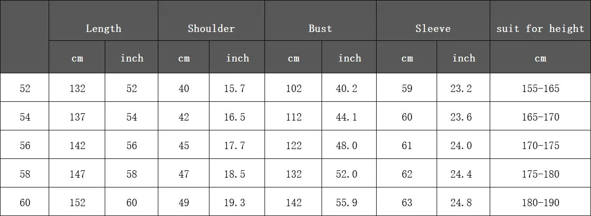 Sizes: 52, 54, 56, 58, 60