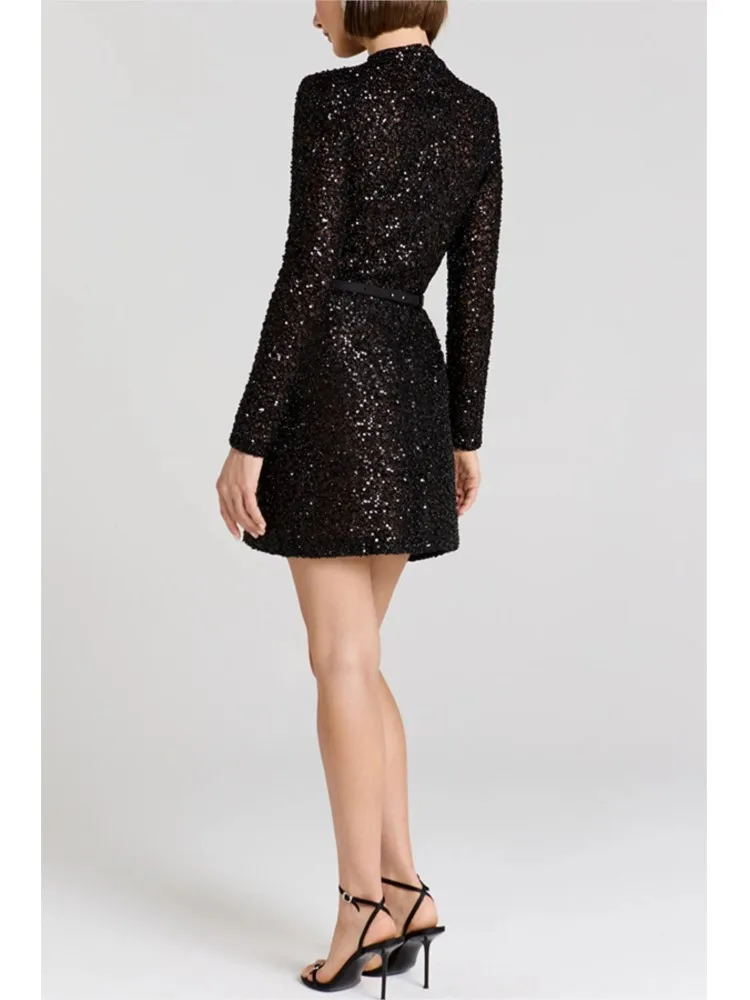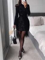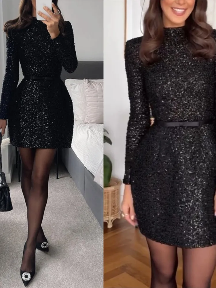 Sequin Evening Dress Women Spring Fashion Casual Long Sleeve O-neck Slim Fit Gowns Dress Female Sexy Shiny Mini Party Dresses